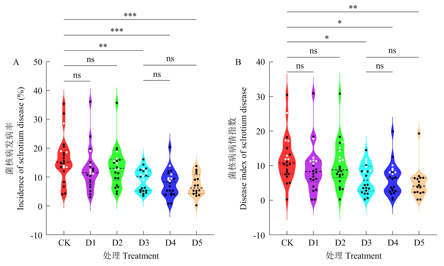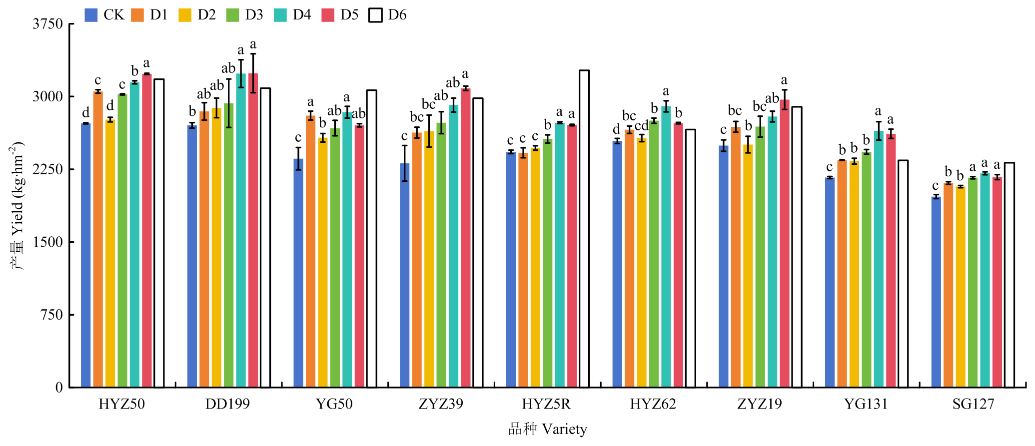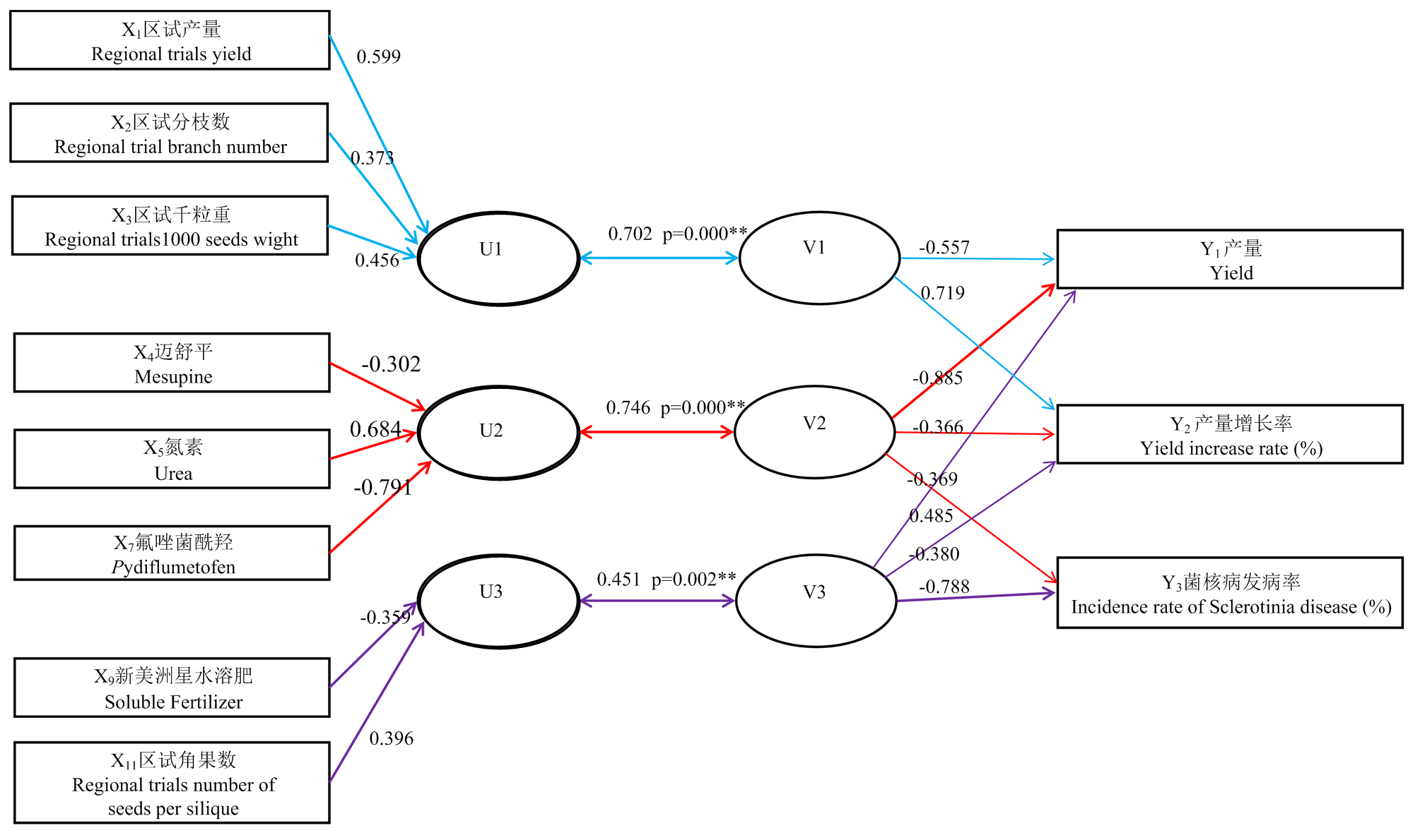【目的】油菜是我国第一大油料作物,提高油菜单位面积产量是增加油菜籽有效供给和提高种植效益的关键途径。在机械化直播条件下,进一步明确品种、越冬调控、病虫害防控等主要技术因素对单产的影响,可为我国油菜单产提升提供理论依据。【方法】选用9个高产优质油菜品种,于2021—2023年开展2年共22个试验点(主产县)的机械化直播种植试验,系统研究减量追施氮肥条件下,油菜品种、种子处理、越冬调控、新型菌核病防控等因素对单产的影响。【结果】采用种子处理(迈舒平包衣防虫,D1)、越冬调控(D2)和新型菌核病防控(氟唑菌酰羟胺,D3)3种组合处理技术均能显著提高减氮追肥(尿素45 kg·hm-2)下油菜的单产,与传统减损技术模式(种子不包衣+不越冬调控及咪鲜胺防治菌核病+追施尿素,CK)的112.5 kg·hm-2相比,分别显著增产6.2%、6.4%和10.9%,产量分别达2 594.2、2 600.4、2 708.9 kg·hm-2,但菌核病发病率仅D3极显著降低49.1%。不同技术组合后对单产提升具有显著的互作效应,种子处理和越冬调控分别与新型菌核病防控技术结合后,比传统技术分别显著增产15.7%和16.1%,产量达2 820.0和2 834.2 kg·hm-2,菌核病发病率分别下降55.6%、55.3%。油菜品种基因型与技术间也存在显著的互作效应,采用新技术能超过该品种的国家区试产量,如阳光131、大地199、中油杂39 3个品种区试产量分别为2 341.2、3 085.5、2 982.0 kg·hm-2,在优化调控技术组合下分别比该品种区试产量增产11.7%、5.0%、3.5%。将油菜品种区试产量和抗病性、不同技术组合等因素与试验产量进行多元逐步回归分析,结果显示品种的区试千粒重、区试产量、新型菌核病防控和减少冬季尿素追肥量是决定产量水平的最关键因素。典型相关分析进一步证实,品种区试产量、区试千粒重和区试角果数决定产量水平,而氟唑菌酰羟胺和迈舒平对增产率具有非常重要的作用,新型菌核病防控技术和越冬抗逆调控与降低菌核病发病率有关。【结论】在油菜机械化生产中,品种的区试产量是影响油菜产量水平的关键因素,利用氟唑菌酰羟胺防治菌核病是当前降低菌核病损失的有效因素,种子处理、越冬调控与菌核病新型防控技术相组合能进一步发挥油菜品种的产量潜力。建议生产上选择高产优质品种,配套种子处理和越冬调控、氟唑菌酰羟胺等减损技术,实现油菜单产显著提升。