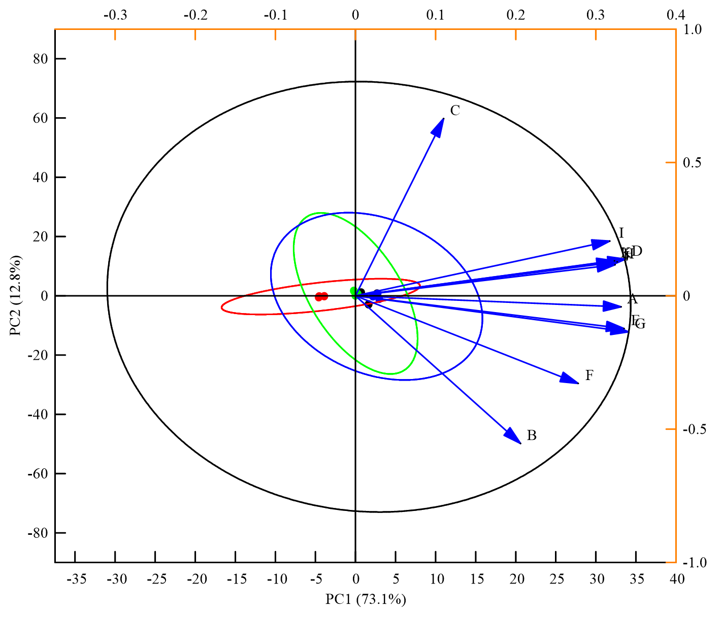 | 处理 Treatment | PC1得分PC1 score | PC2得分 PC2 score | 综合得分 Overall score | 综合排名 Overall ranking | |