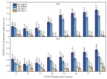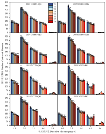 【目的】揭示滴灌水肥一体化条件下种植密度对夏玉米受精结实特性的调控机制,明确水肥一体化条件下玉米种植密度与穗粒数和产量形成的关系。【方法】于2023—2024年,选用中大穗型玉米品种登海605(DH605)和小穗型玉米品种MY73为试验材料,设置畦灌灌水和肥料播前一次性基施的传统水肥管理方式(QG)与滴灌水肥一体化管理方式(DG),以1.5万株/hm2为梯度,设置1.5—12.0万株/hm2共8个种植密度,探讨滴灌水肥一体化条件下种植密度对夏玉米受精结实特性和产量形成的影响。【结果】与QG处理相比,DH605和MY73两品种在DG处理下的株高、叶面积密度(SDLA)均升高,雌雄穗分化进程加快;雄穗小花数增加、败育率下降,雌穗花丝数、总小花数及受精小花数增多,且小花结实率、总结实率提高;雌雄间隔期(ASI)缩短约1 d,空秆率下降,最高产量分别提升7.6%和6.4%。在不同水肥管理下,随种植密度的增加,两品种的株高和SDLA均上升,但雌雄穗发育受抑:雄穗小花数减少、败育率升高;雌穗吐丝数、受精小花数减少,小花受精率和总受精率先升后降;高密条件下ASI延长约1 d,空秆率和秃顶长度增加,产量呈先升后降趋势。此外,MY73的雌雄穗分化进程快于DH605,ASI更短,株高更低且SDLA更大,其小花结实率和总结实率随SDLA的升高,下降幅度不显著,且达到最大产量的种植密度更高。【结论】在本试验条件下,种植密度过高会对受精结实特性产生显著负面影响,进而影响穗粒数的建成,不利于产量的提高。滴灌水肥一体化技术相较于传统灌溉方式,可有效缓解高密度条件对夏玉米受精结实特性造成的负面影响,进而提高产量,其中DH605和MY73分别在种植密度为6.0和7.5万株/hm2时达到最大产量。