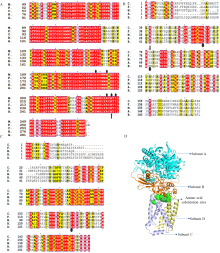 不同作物病原真菌中琥珀酸脱氢酶复合体B、C、D亚基的同源比对 A:琥珀酸脱氢酶复合体B亚基的同源比对Homology alignment of succinate dehydrogenase complex B subunit;B:琥珀酸脱氢酶复合体C亚基的同源比对Homology alignment of succinate dehydrogenase complex C subunit;C:琥珀酸脱氢酶复合体D亚基的同源比对Homology alignment of succinate dehydrogenase complex D subunit;D:琥珀酸脱氢酶复合体中氨基酸替换位点的位置Position of amino acid substitution sites in succinate dehydrogenase complex。黑色圆点代表稻瘟病菌中氨基酸的替换位置,黑色箭头代表高粱炭疽病菌中氨基酸的替换位置Black dots represent the substitution position of amino acids in M. oryzae, black arrows represent the substitution position of amino acids in C. sublineola;A、B、C、F、M:分别代表链格孢、灰葡萄孢、高粱炭疽病菌、禾谷镰孢和稻瘟病菌A. alternata, B. cinerea, C. sublineola, F. graminearum and M. oryzae, respectively"