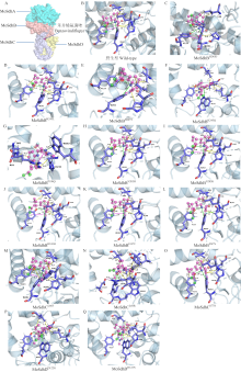 苯并烯氟菌唑与不同类型稻瘟病菌MoSdh的分子对接结合模式 A:苯并烯氟菌唑与稻瘟病菌MoSdh对接的活性口袋位置Active pocket position of benzovindiflupyr docking with MoSdh of M. oryzae;B:苯并烯氟菌唑与野生型稻瘟病菌MoSdh的结合模式Binding mode of benzovindiflupyr to MoSdh of wild-type M. oryzae;C—Q:苯并烯氟菌唑与不同类型氨基酸替换菌株MoSdh的结合模式Binding mode of benzovindiflupyr to MoSdh of different types of amino acid substitution strains"