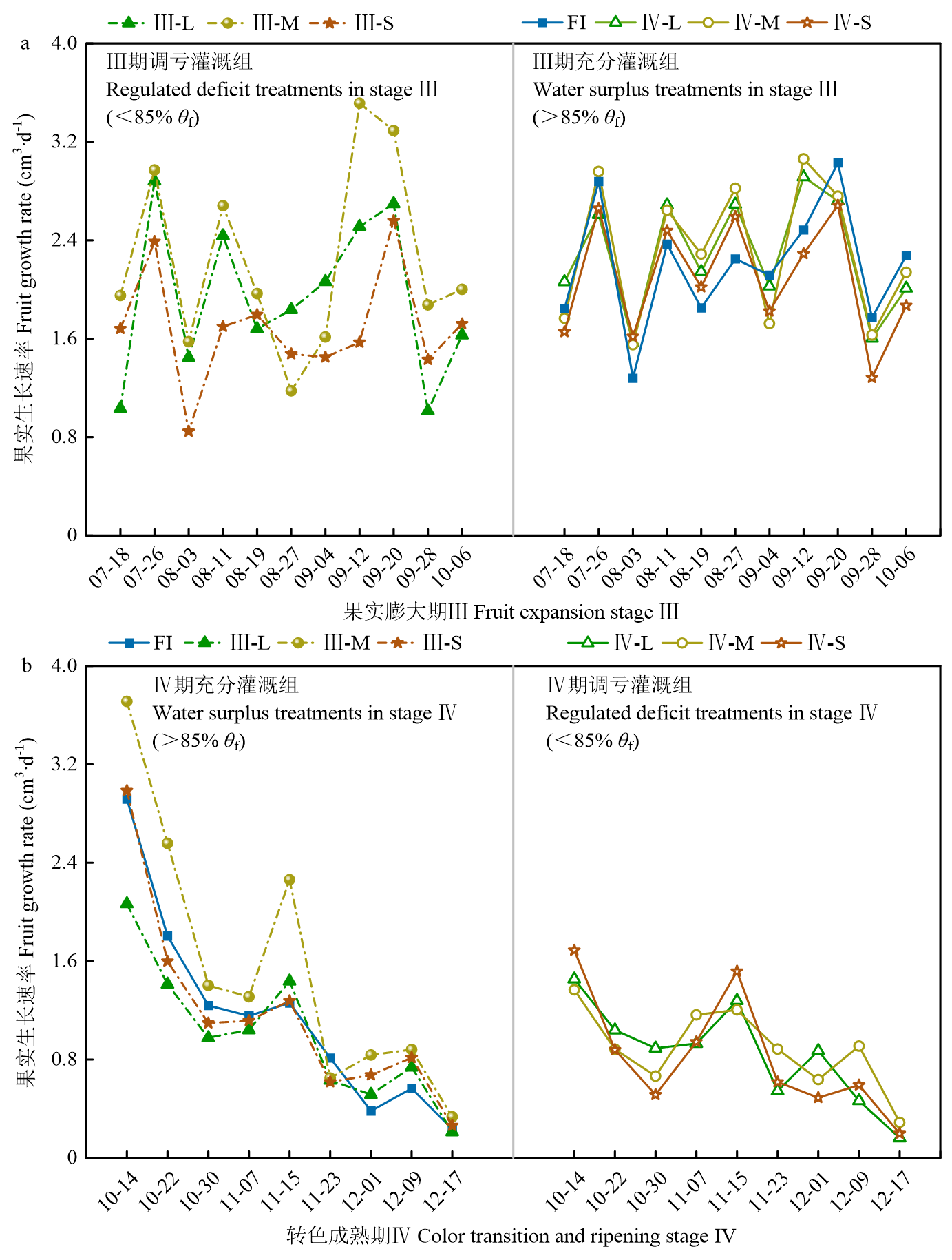 【目的】明确不同土壤墒情(以土壤含水率为量化指标)对南方红壤丘陵区脐橙果实生长、产量和品质的影响,为建立赣南脐橙优质高效生产的调亏灌溉制度提供理论依据。【方法】以赣南地区6年生纽荷尔脐橙为试材,基于田间持水率(θf)的不同百分比划定4个水分梯度:调亏灌溉L(75%—85% θf)、M(65%—75% θf)、S(60%—70% θf)与充分灌溉FI(>85% θf),分析果实膨大期(III期)与转色成熟期(IV期)两个关键生育阶段下,不同土壤水分条件对果实膨大、转色过程以及果实产量、水分利用效率和各项品质指标的影响,采用主成分分析法(PCA)构建果实品质综合评价体系,对各处理进行量化评分与排序。【结果】III期果实生长迅速,调亏灌溉显著影响果实生长速率,均值较FI降低10.96%,但III-M处理复水后呈现良好补偿效应,生长速率高于FI。此阶段转色进程缓慢,各处理间果实色泽指数CCI无显著差异。产量与品质分析表明,III期调亏灌溉可显著提升果实综合品质但抑制产量,III-S和III-M处理果实综合品质最优,其可溶性固形物、可溶性糖和VC含量明显提升,而产量分别仅为最高产处理的57.41%和64.19%,证实该阶段重度水分胁迫不具生产可行性。Ⅳ期果实生长速率显著降低并呈现加速下降趋势,至转色末期趋于停滞。各处理果实色泽指数CCI呈现加速上升特征,其中III-S、IV-L和IV-M处理的转色程度较FI最为显著(P<0.05),分别提高20.38%、12.99%和10.57%。IV期调亏灌溉可实现产量、品质与水分利用效率的协同提升,与FI相比,IV-M处理使可溶性固形物与可溶性糖含量分别提高3.37%与1.18%,产量提高23.56%;IV-S处理重度水分胁迫使果实糖分分别下降5.74%与3.15%,产量降低8.05%,证实IV期调亏存在最优土壤水分阈值。【结论】IV-M处理既实现最高单株产量15.05 kg与水分利用效率16.89 kg·m-3,也使综合品质得分排序第3,为权衡高产与优质的最优决策。在果实膨大期维持>85% θf、转色成熟期维持65%—75% θf的土壤墒情,为适宜赣南地区脐橙种植的最优水分管理方案。