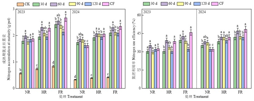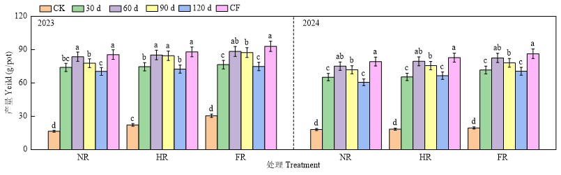 缓释氮(肥)产品比较对水稻产量的影响 NR:秸秆不还田 No straw return;HR:秸秆半量还田 Half straw return;FR:秸秆全量还田 Full straw return;CK:不施肥 No fertilizer;CF:常规精确定量施肥 Conventional precise quantitative fertilization。不同小写字母表示同一时期中不同肥料处理在0.05水平上差异显著 Different lowercase letters indicate significant differences at the 0.05 level between different fertilizer treatments during the same period。下同 The same as below"