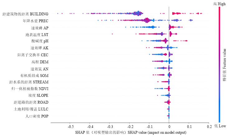 【背景】重庆市罗盘山猪是国家和地方重点保护的珍稀地方猪种,当前已处于濒危状态,亟需开展抢救性保护。在原地保护的基础上,建立保种场等异地保护措施可作为有效补充以应对原生地生态破坏或非洲猪瘟等突发疫情导致的种群锐减风险。【目的】根据农业农村部《畜禽遗传资源保种场保护区和基因库管理办法》的要求,异地保种场的场址应选择与原产地自然生态条件一致或相近的区域。为明确重庆市范围内适合罗盘山猪生存与繁衍的潜在区域,指导今后异地保护和保种场选址,并为规模化养殖提供科学依据。【方法】基于重庆市现场直接监测获得的105个罗盘山猪分布位点信息,采用机器学习(scikit-learn)库构建随机森林机器学习器以分析土壤(速效磷、速效钾、速效氮、阳离子交换率、有机质组成、酸碱度)、地表温度、降水量、高程、距水系的距离等16个环境与人为因子特征重要性,通过沙普利加法解释(shapley additive explanations, SHAP)量化每个特征对模型预测结果的边际贡献。同时,利用16个环境因子构建初始模型,在Python环境中对所有因子进行皮尔逊相关系数(pearson correlation coefficient, PCC)的成对矩阵分析。综合多阶段环境因子的筛选与对比,对所得变量进行方差膨胀因子(variance inflation factor, VIF)共线性复查,最终将最后筛选的环境变量和物种分布数据加载到最大熵模型(maximum entropy model, MaxEnt)中,分析了罗盘山猪适生区的分布状况及主要环境影响因子。【结果】平均训练集的曲线下面积(area under the curve, AUC)值为0.995,预测结果达到优秀水平;影响重庆市罗盘山猪生境适宜性的主要环境因子为降水量(39.7%)、酸碱度(24.1%)、速效磷(18.9%)、地表温度(6.2%)和距建筑的距离(5.7%),总贡献值为94.6%;次要环境因子包括速效钾(1.9%)、高程(1.4%)、河流(1.2%)、阳离子交换容量(0.8%)与速效氮(0.1%),总贡献值为5.4%;罗盘山猪在重庆市的适生区主要零散分布于潼南区,合川区,大足区与荣昌等区,总面积为4 217.59 km2,占重庆市土地面积的5.1%。其中,高适生区面积为189.44 km2,具体包括潼南区的新胜镇、卧佛镇、塘坝镇,大足区的高坪镇、三驱镇、珠溪镇、邮亭镇等,荣昌区峰高街道与万灵镇,铜梁区的维新镇,永川区茶山竹海街道等。较高适生区面积为554.97 km2。较低适生区面积为1 034.78 km2,低适生区面积为2 438.39 km2【结论】本研究不仅为重庆市罗盘山猪的异地保护时保种场选址提供决策支持,也可为其他地方珍稀畜禽的生境适宜性评估与科学管理提供参考。