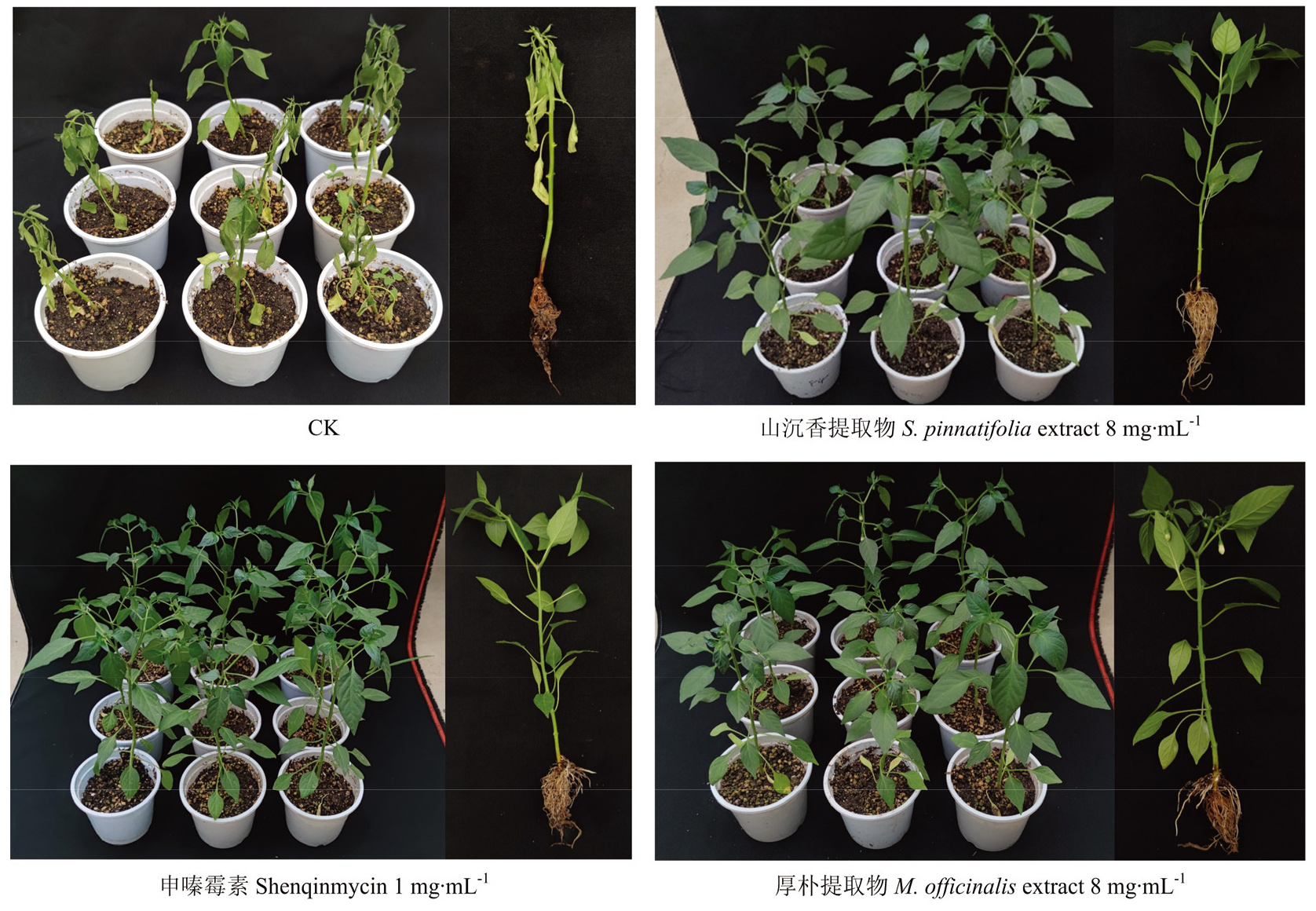 【目的】 目前农业生产上多种土传病害频发难防,现有防治药剂易造成残留和药害,鉴于植物源杀菌剂具有广谱抑菌活性、环境友好及易代谢与降解等特点,本研究以辣椒疫霉(Phytophthora capsici)和西瓜枯萎病菌(Fusarium oxysporum f. sp. niveum)两种典型的土传病原菌为研究对象,通过对供试75种植物提取物的抑菌活性测定,筛选具有较高活性的植物资源,为新型植物源杀菌剂开发打下基础。【方法】 采用生长速率法测定75种植物乙醇提取物对辣椒疫霉和西瓜枯萎病菌的抑制活性,通过灌根法和伤根法测定筛选出的高活性植物提取物对辣椒疫病和西瓜枯萎病的盆栽防效。【结果】 厚朴、羌活、山沉香、侧柏和冬青5种植物乙醇提取物在1 mg·mL-1浓度下对辣椒疫霉的菌丝抑制率在60%以上,茜草、乌药等11种植物乙醇提取物的抑制率在30%—60%,其余59种植物提取物无明显抑制活性,其中厚朴乙醇提取物对辣椒疫霉毒力最高,EC50为0.023 mg·mL-1;厚朴、川芎和姜黄3种植物乙醇提取物在1 mg·mL-1浓度下对西瓜枯萎病菌的菌丝抑制率在60%以上,高良姜、山沉香等12种植物乙醇提取物的抑制率在30%—60%,其余60种植物提取物无明显抑制活性,其中姜黄乙醇提取物对西瓜枯萎病菌毒力最高,EC50为0.606 mg·mL-1。盆栽防效试验结果表明,厚朴乙醇提取物在8 mg·mL-1浓度下对辣椒疫病有较高的保护和治疗作用,防治效果分别为64.74%和63.25%,山沉香乙醇提取物在8 mg·mL-1浓度下对辣椒疫病有较高的治疗作用,其防治效果为63.14%,二者均低于对照药剂申嗪霉素(保护防效81.05%,治疗防效73.72%);姜黄乙醇提取物在8 mg·mL-1浓度下对西瓜枯萎病有较高的保护作用,其防治效果为69.94%,与对照药剂多菌灵相当(66.65%),在2 mg·mL-1浓度下对西瓜枯萎病有较高的治疗作用,其防治效果为78.08%,优于对照药剂多菌灵(62.42%);而高良姜乙醇提取物在供试浓度下对西瓜枯萎病的盆栽防效均低于50%。【结论】 山沉香、姜黄和厚朴3种植物提取物对土传病菌具有较好的抑制效果,为后续新型植物源杀菌剂的研发提供了科学依据。