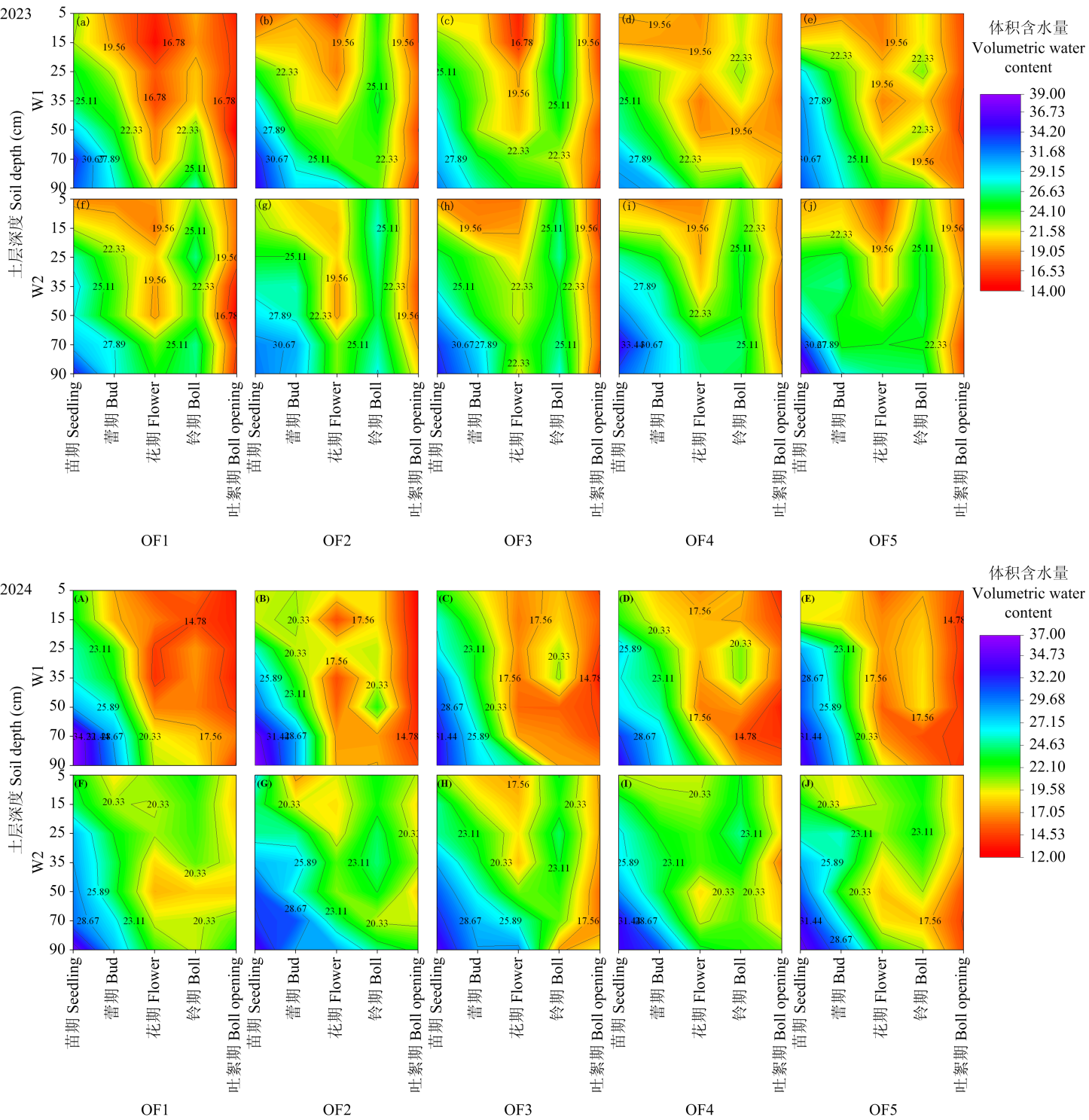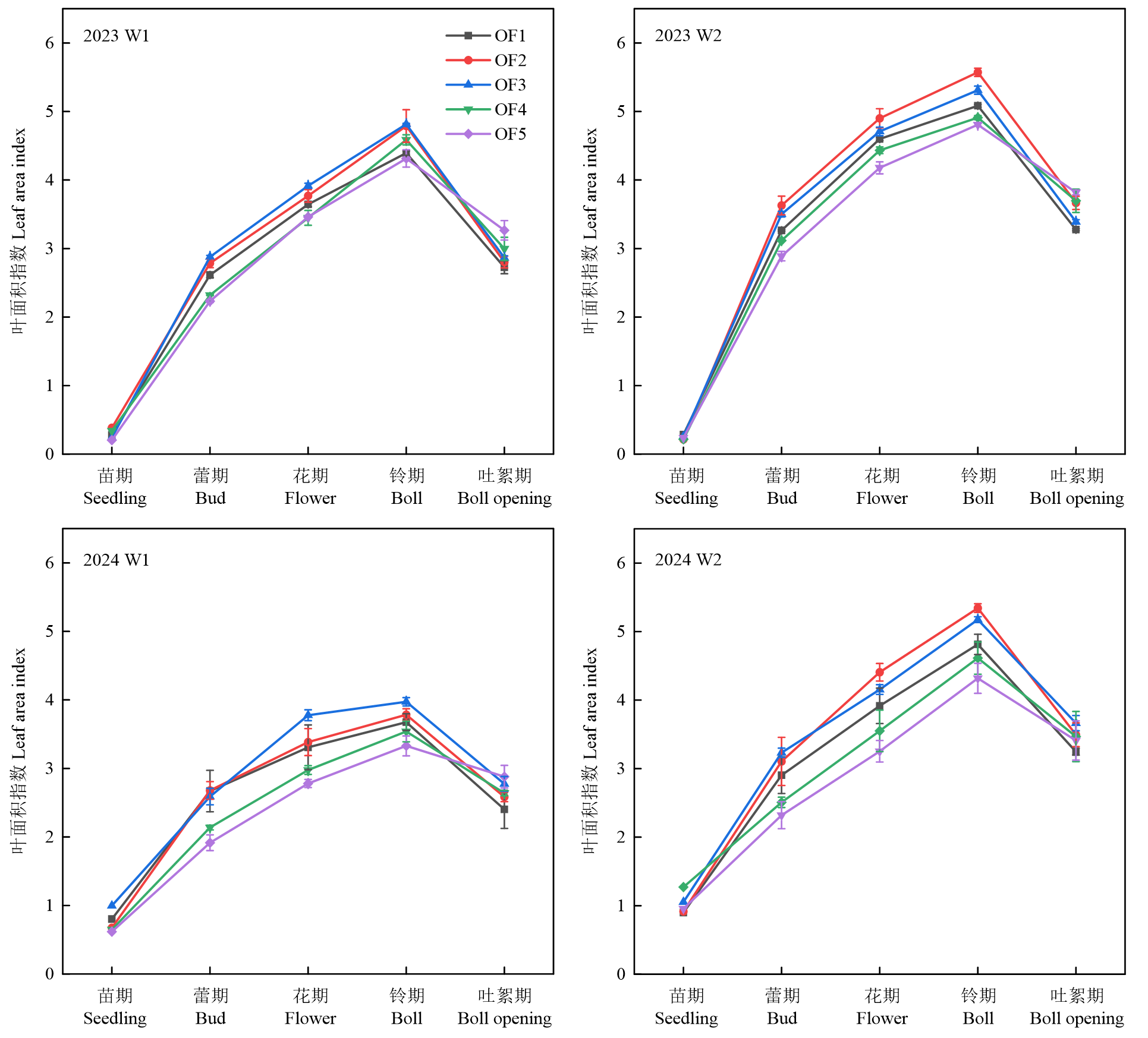 | W2OF4 | 5.50±0.06ab | 5.37±0.08a | 7.25±0.11bc | 7.33±0.10b | 6381.52±92.01bc | 6226.62±91.73ab | 515.85c | 497.48b | 1.24±0.02ef | 1.25±0.02e |