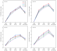| 年份 Year | 处理 Treatment | Ymax (kg·hm-2) | R2 | T1 (d) | T2 (d) | T3 (d) | ΔT (d) | Vmax (kg·hm-2·d-1) |