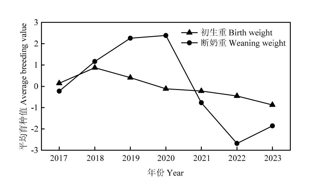 【背景】中国荷斯坦牛是我国主要的乳用牛品种,其生产性能直接关系到产业的经济效益。初生重和断奶重是评估犊牛健康和未来产奶潜力的关键早期性状,系统掌握其遗传规律是实现高效遗传改良的基础。然而,基于我国大规模荷斯坦牛群体,系统评估其初生重与断奶重遗传参数、育种值及遗传趋势的研究仍相对有限。【目的】探究影响中国荷斯坦牛初生重和断奶重的非遗传因素,同时估计其遗传参数及育种值,为我国荷斯坦牛的高效选育提供理论依据。【方法】收集河北省某规模化荷斯坦牛牧场2017—2023年的完整生产记录。经过严格的数据清洗,并追溯其完整的三代系谱,最终获得来自5 798头母牛,100头公牛的15 672头荷斯坦犊牛的有效初生重和断奶重数据。采用SPSS 26.0软件的GLM模型分析出生年份、出生季节、胎次、性别及产犊类型等固定效应对荷斯坦牛初生重和断奶重的影响。使用DMU软件的AI-REML结合EM算法,通过拟合双性状动物模型估计荷斯坦牛初生重和断奶重的各方差组分,计算初生重和断奶重的遗传力及两性状间遗传相关。利用动物模型BLUP法估计所有个体的育种值,并通过对种公牛育种值排名、后代性能比较以及遗传趋势分析,评估育种实践的效果。【结果】对荷斯坦牛初生重和断奶重数据描述性统计显示:荷斯坦牛初生重均值为(40.05±4.53) kg,断奶重均值为(100.31±8.60) kg。固定效应显著性检验结果表明:出生年份、出生季节、胎次、性别及产犊类型对荷斯坦牛初生重和断奶重均具有极显著影响(P<0.01)。初生重直接遗传力为0.57(0.04),断奶重直接遗传力为0.39(0.02),均属于高遗传力性状。初生重与断奶重之间存在中高强度的正向遗传相关,估计值为0.46±0.04。育种值估计准确性高,排名前十的种公牛,其后代的平均初生重(40.26 kg)和断奶重(104.41 kg)均显著高于排名后十的种公牛后代(39.08 kg、97.90 kg)。对荷斯坦犊牛初生重和断奶重绘制遗传趋势图可知,随出生年份的增长,初生重和断奶重的平均育种值变化较大,整体呈现波动下降趋势。【结论】荷斯坦牛初生重和断奶重受年份、性别等影响,证实初生重和断奶重的高遗传力以及两性状间中高遗传相关,支持对其进行协同选育。筛选出早期生长性状优异的种公牛,建议在实际育种中优先选用断奶重育种值高而初生重适中的种公牛。研究揭示了中国荷斯坦牛早期体重性状的遗传规律,为中国荷斯坦牛初生重和断奶重性状的遗传选育和平衡育种策略的制定提供了理论基础和数据支持。