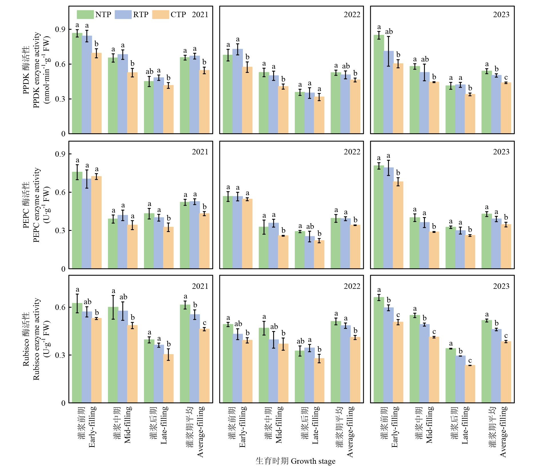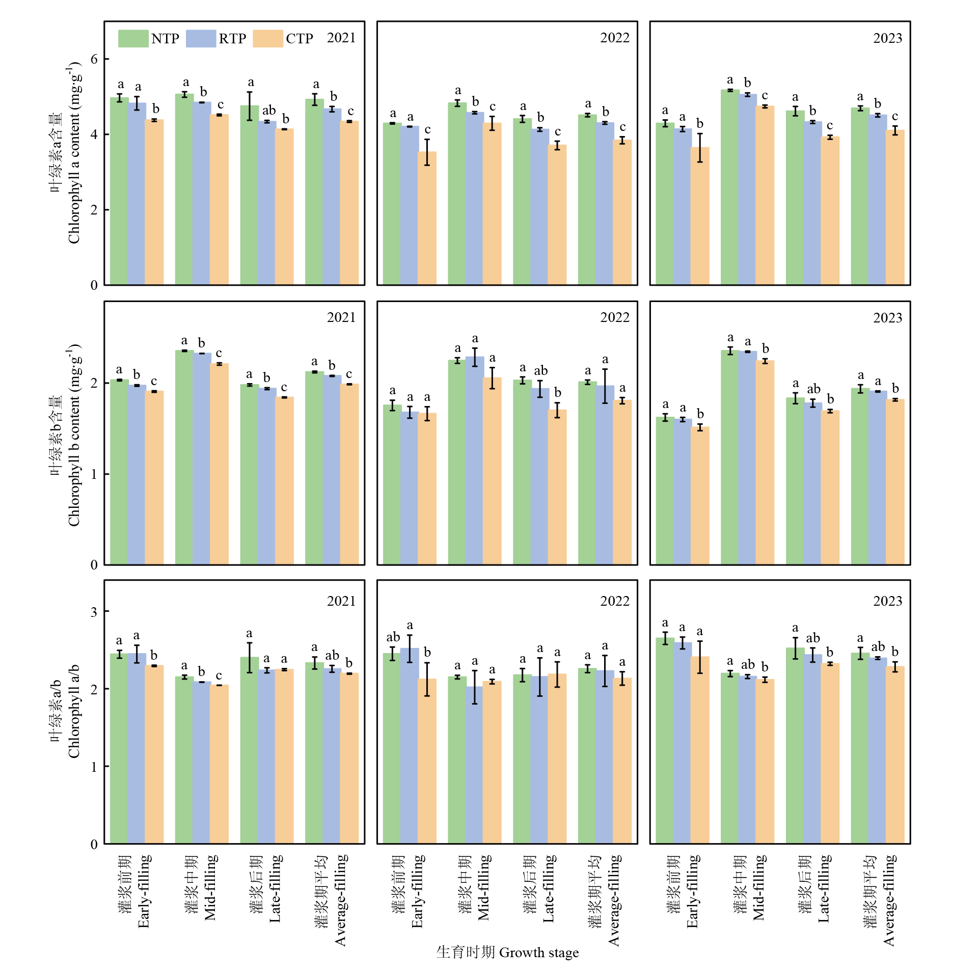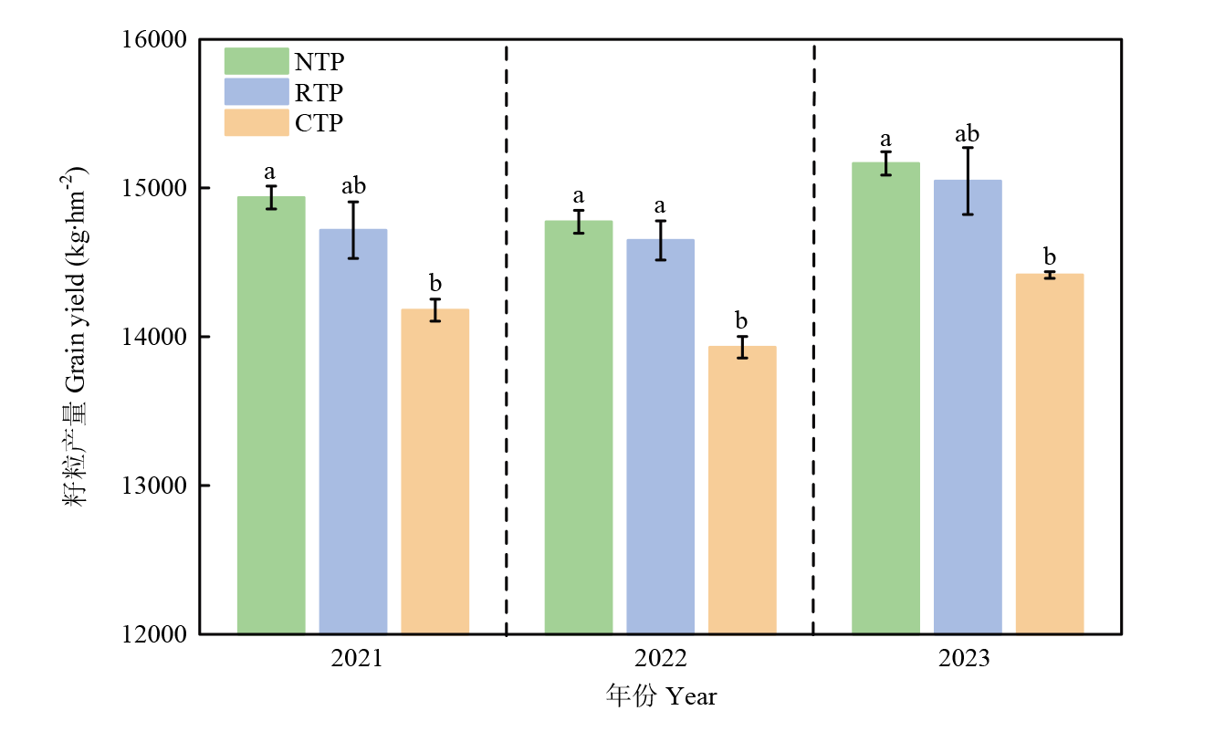 【目的】针对绿洲灌区传统玉米种植地膜投入量大、极端高温易引起玉米灌浆期叶片光合性能低、产量下降等问题,通过研究地膜两年覆盖利用下玉米灌浆期的光合生理机制,旨在为绿洲灌区地膜减量条件下实现玉米高产提供理论支持。【方法】始于2013年在河西走廊绿洲灌区的随机区组试验,本研究于2021—2023年,根据地膜覆盖时间长短形成3种处理:免耕一膜两年覆盖利用(NTP);秋免耕春覆膜(RTP);传统耕作每年覆新膜(对照组,CTP)。探究玉米灌浆期叶片叶绿素含量、气体交换参数、光合生理关键酶活性、基因相对表达量及关键蛋白含量对不同地膜利用方式的响应。【结果】不同地膜利用方式通过调控玉米灌浆期的光合生理特性,促使玉米增产稳产。与CTP处理相比,NTP灌浆期叶绿素a、b平均提高15.1%、8.3%,说明NTP处理有利于维持玉米叶绿素含量,从而有效延缓了叶绿素的降解,促进玉米光合作用。NTP较CTP处理净光合速率和蒸腾速率在灌浆中期、后期分别平均提高25.2%和11.5%、20.0%和12.2%,说明NTP处理有利于调节玉米灌浆期的气体交换参数,增强了玉米灌浆期光合作用。同时,NTP在灌浆期维持较高的光合生理关键酶活性、基因相对表达量及关键蛋白含量,为光合作用的提高提供了保障。与CTP处理相比,NTP处理玉米叶片丙酮酸磷酸二激酶(PPDK)、磷酸烯醇式丙酮酸羧化酶(PEPC)和1,5-二磷酸核酮糖羧化酶(Rubisco)活性平均提高了18.9%、20.0%和30.6%,玉米叶片pepc、ppdk、rub基因表达量分别提高22.1%、75.8%和70.6%,光合反应中心D1、D2蛋白含量分别提高了12.6%和13.2%;RTP较CTP处理玉米叶片PPDK、PEPC和Rubisco活性平均提高了15.6%、16.4%和19.2%,玉米叶片pepc、ppdk、rub基因表达量分别提高13.6%、53.9%和57.7%,光合反应中心D1蛋白含量提高了10.1%。此外,NTP较CTP处理玉米籽粒产量在2021、2022和2023年分别提高了5.2%、6.0%和5.3%;RTP较CTP处理玉米籽粒产量仅在2022年提高了5.2%。【结论】免耕一膜两年覆盖利用是西北绿洲灌区维持较高光合性能、地膜减投、实现玉米增产的有效栽培管理措施。