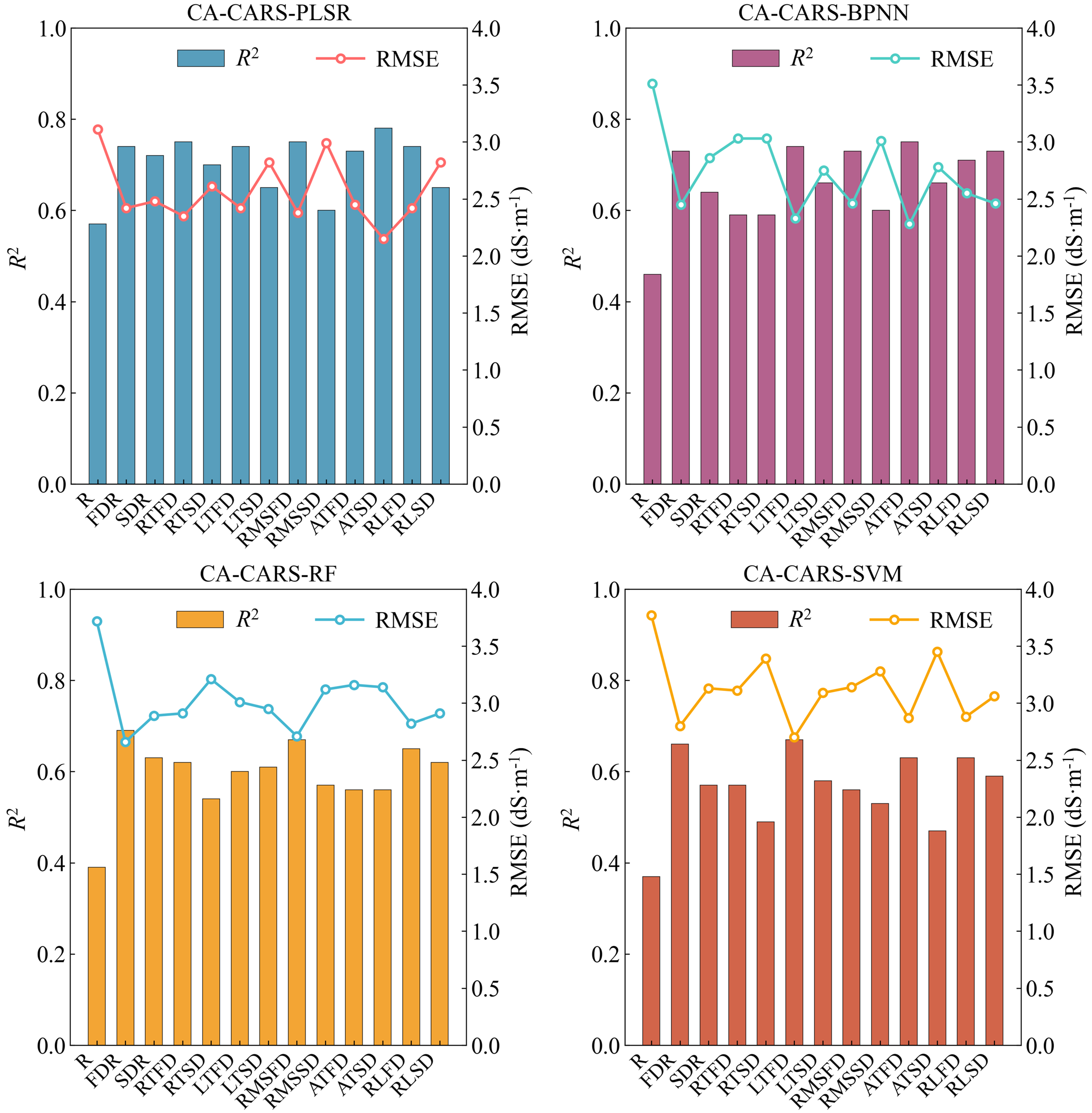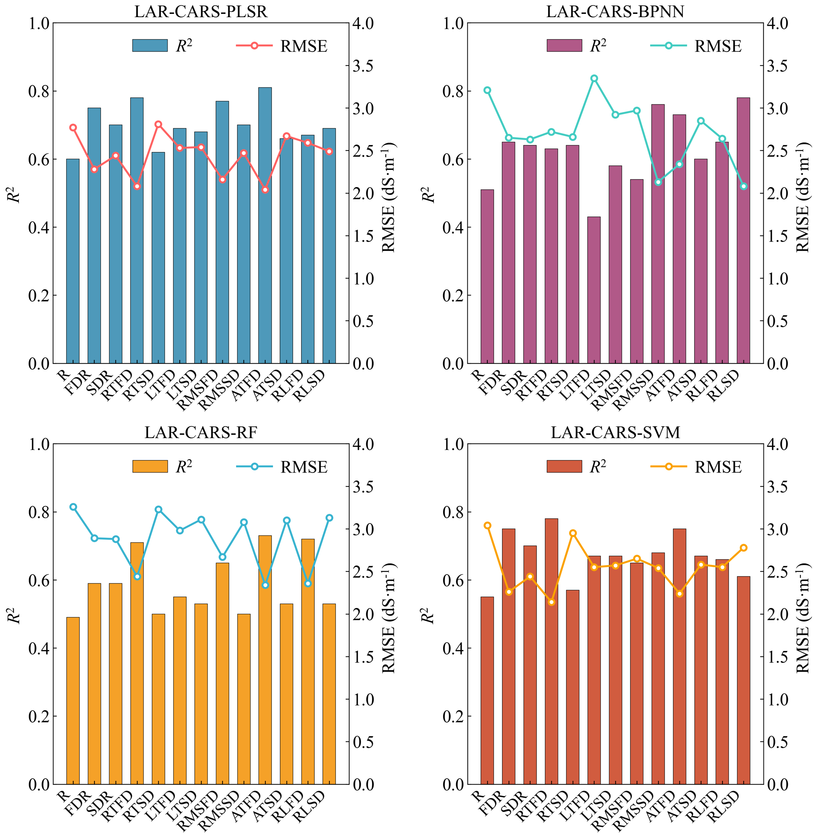 【目的】土壤盐渍化导致土壤结构恶化、作物减产及生态系统退化,是威胁干旱区农业可持续发展的关键环境问题。本研究旨在利用光谱变换、波段筛选以及多种机器学习方法,构建土壤盐分预测模型,快速、准确地预测土壤盐分,为盐渍化农田的科学管理提供技术支撑。【方法】以达拉特旗农田土壤为研究对象,系统采集土壤样品并测定其电导率(EC)与光谱反射率数据。首先,采用Savitzky-Golay(S-G)滤波对原始光谱(R)进行平滑去噪,在此基础上系统开展包括倒数、对数、一阶微分、二阶微分等在内的12种光谱变换处理,以挖掘隐含光谱特征。进而,分别采用相关性分析(CA)和最小角回归(LAR)方法进行特征降维,并结合竞争性自适应重加权采样(CARS)算法进一步筛选敏感特征波段。最后,基于优选特征分别构建偏最小二乘回归(PLSR)、支持向量机(SVM)、反向传播神经网络(BPNN)和随机森林(RF)模型,通过决定系数(R2)和均方根误差(RMSE)综合评价模型性能,对比特征集在不同算法中的建模效果。【结果】原始光谱经过光谱变换后,相关系数均有不同程度的提升,表明光谱变换能显著增强土壤盐分与光谱特征的相关性;在使用竞争性自适应重加权采样进行特征波段优选时,最小角回归比相关性分析具有更好的特征降维效果;倒数对数一阶微分(ATFD)结合偏最小二乘回归模型表现最优,其验证集精度为R2=0.81、RMSE=2.04 dS·m-1;不同建模方法对比显示,偏最小二乘回归模型的预测性能优于其他3种模型(反向传播神经网络/随机森林/支持向量机),表明偏最小二乘回归模型更适合该区域土壤盐分的预测。【结论】基于ATFD-LAR-CARS-PLSR的土壤盐分高光谱预测模型精度高、预测能力最优,证实了高光谱技术结合多维度特征优化可有效实现干旱区土壤盐分预测。