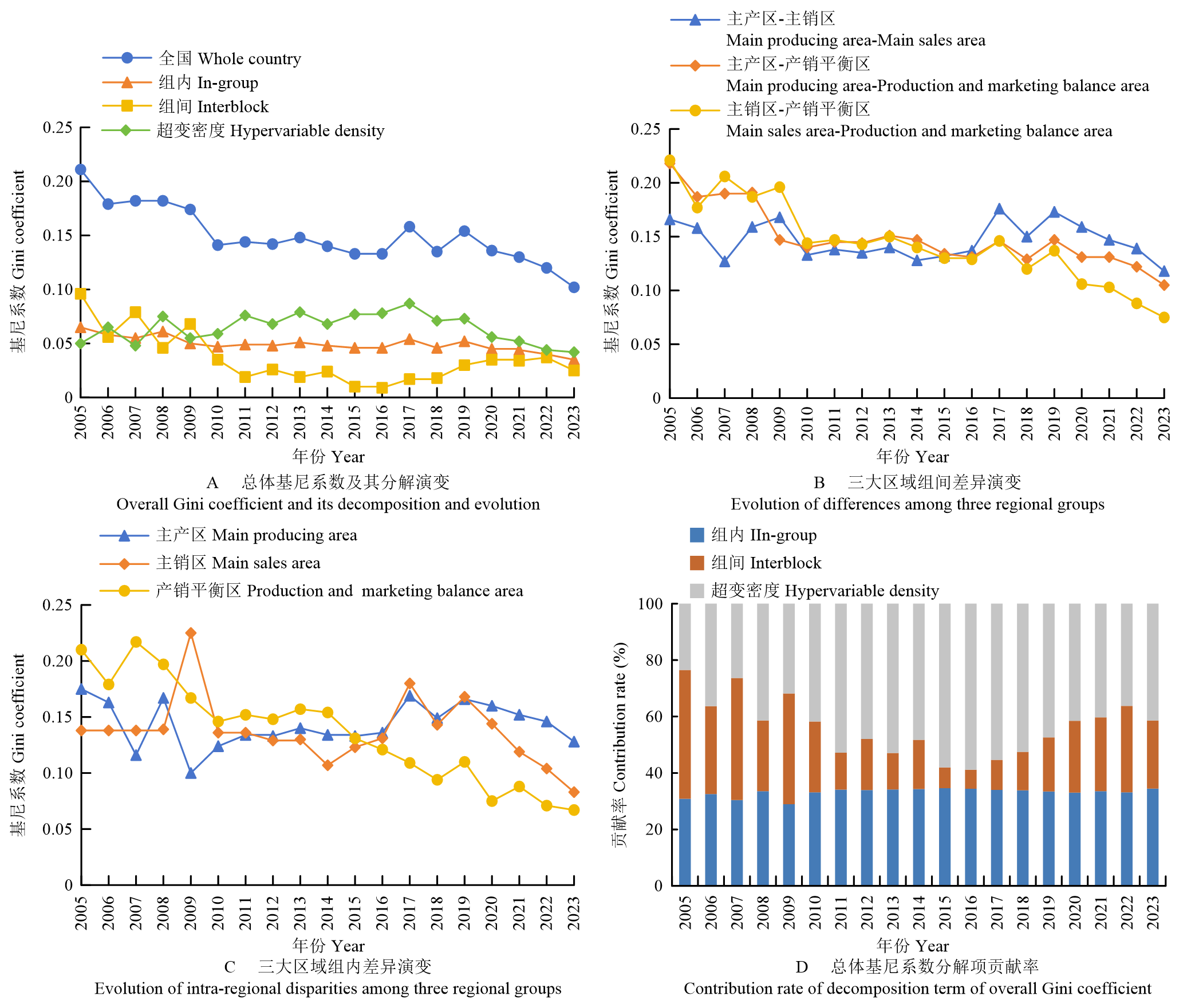 | 主产区 Main producing area | 主销区 Main sales area | 产销平衡区 Production and marketing balance area | 主产区-主销区 Main producing area-Main sales area | 主产区-产销平衡区 Main producing area-Production and marketing balance area | 主销区-产销平衡区 Main sales area- Production and marketing balance area | 组内 In- group | 组间 Interblock | 超变密度 Hypervariable density | ||