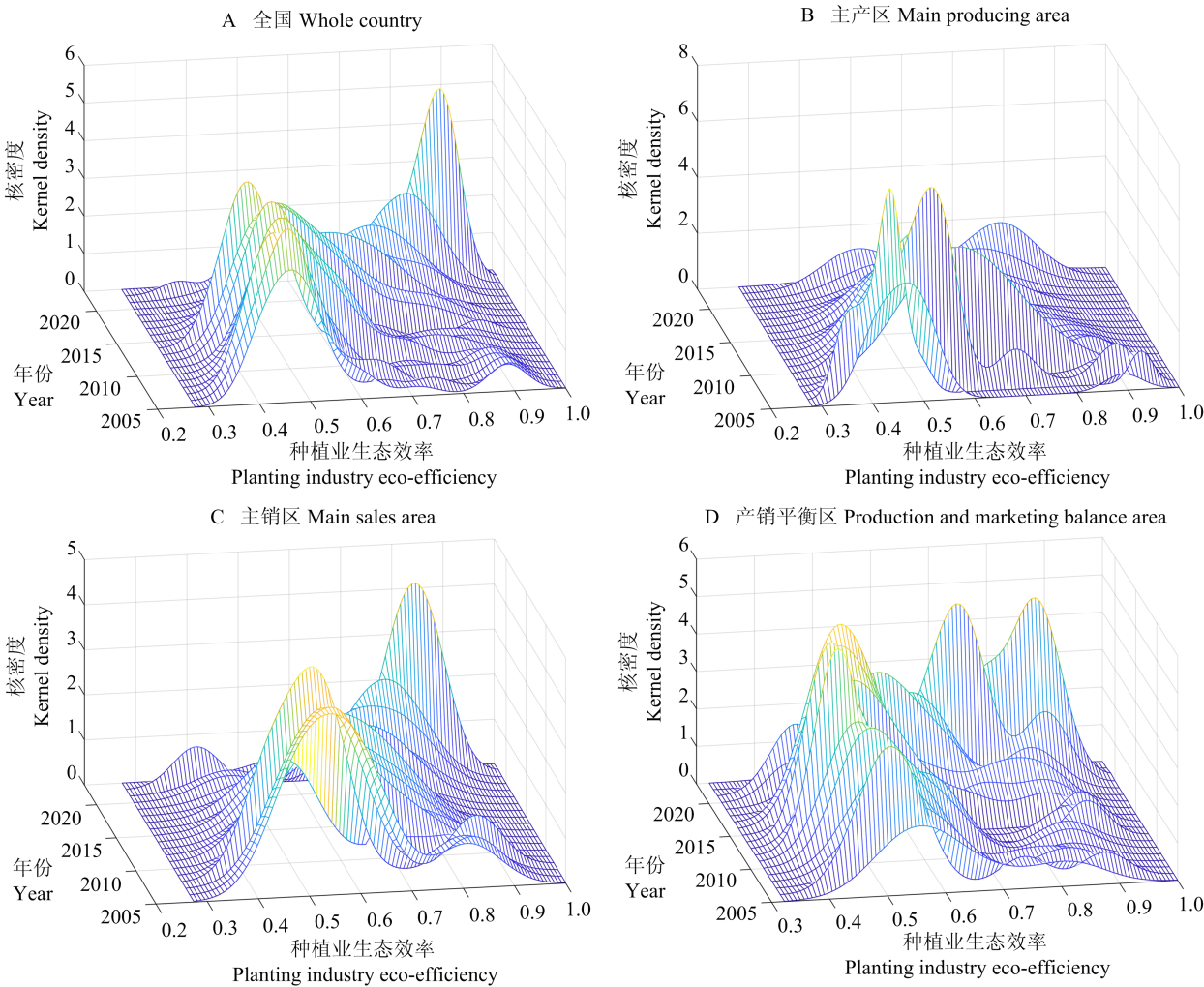 【目的】基于当前践行“双碳”战略、推进种植业绿色高质量发展的现实背景,厘清种植业生态效率的现状特征、时空格局以及动态演进特征,为加快推进种植业绿色低碳转型提供参考依据。【方法】在科学重构评价指标体系的基础上,首先利用SBM-Undesired模型对中国种植业生态效率进行测算并分析其现状特征;然后运用Dagum基尼系数明晰其区域差异及成因,接下来使用空间自相关模型解析其空间集聚特征;最后利用核密度估计、Markov链方法考察其动态演进特征。【结果】2005—2023年中国种植业生态效率整体得到了显著提升,其省域效率均值增幅高达87.95%,并由最初的差异明显逐步演变为“水平较高且齐头并进”的新格局;具体到3大功能区,种植业生态效率增幅由高至低依次为粮食主销区、主产区和产销平衡区。中国种植业生态效率的总体差异大幅缩小,逐步趋向同一性;区域差异来源以超变密度贡献最大、组内差异贡献其次、组间差异贡献最小。自2009年起,中国种植业生态效率持续表现出空间集聚特征,同时存在明显的空间聚类特征,且高-高型省份数量由少到多,而低-低型省份数量由多到少,空间集聚格局整体呈现出良好发展态势。随着时间的推移,全国以及3大功能区种植业生态效率均处于提升态势且由多极逐步转为单极;同时,种植业生态效率水平在各自等级较为稳定,存在“俱乐部趋同”特征;引入空间因素后,各省份种植业生态效率等级的稳定性受到影响,但高水平省份通常能够释放正向的溢出效应。【结论】中国种植业生态效率整体得到了显著提升,但具体到各功能区又表现出一定差异;中国种植业生态效率的总体差异呈明显下降趋势,其差异来源以超变密度贡献最大;中国种植业生态效率表现出一定的空间依赖性与异质性;全国以及3大功能区种植业生态效率的动态演进特征同中有异。应通过建立健全政策支持体系、厘清关键影响因素、强化区域交流与互助、构建风险防范机制等措施确保种植业生态效率处在高水平层次。