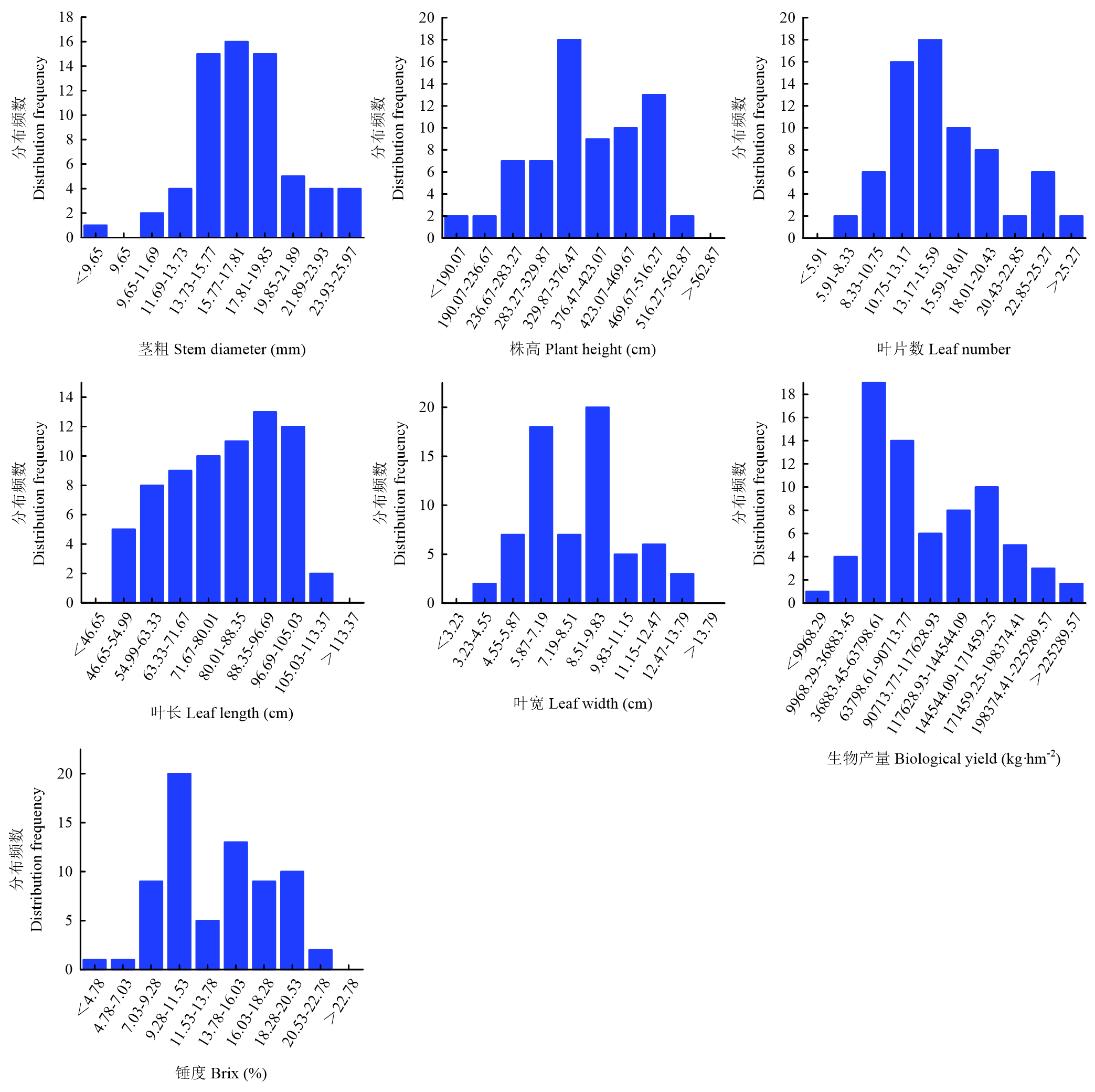 | 性状 Traits | 株高 PH | 茎粗 SD | 叶片数 LN | 叶长 LL | 叶宽 LW | 锤度 B | 生物 产量 BY | 叶脉色 MC | 茎秆髓 部质地 SPT | 生育 时期 GS |