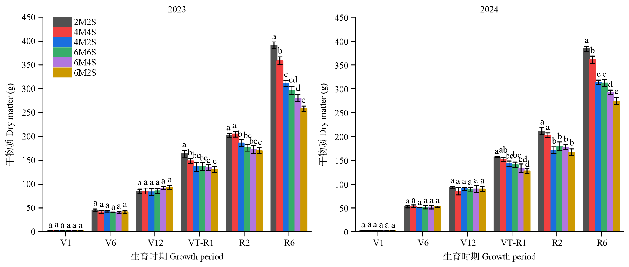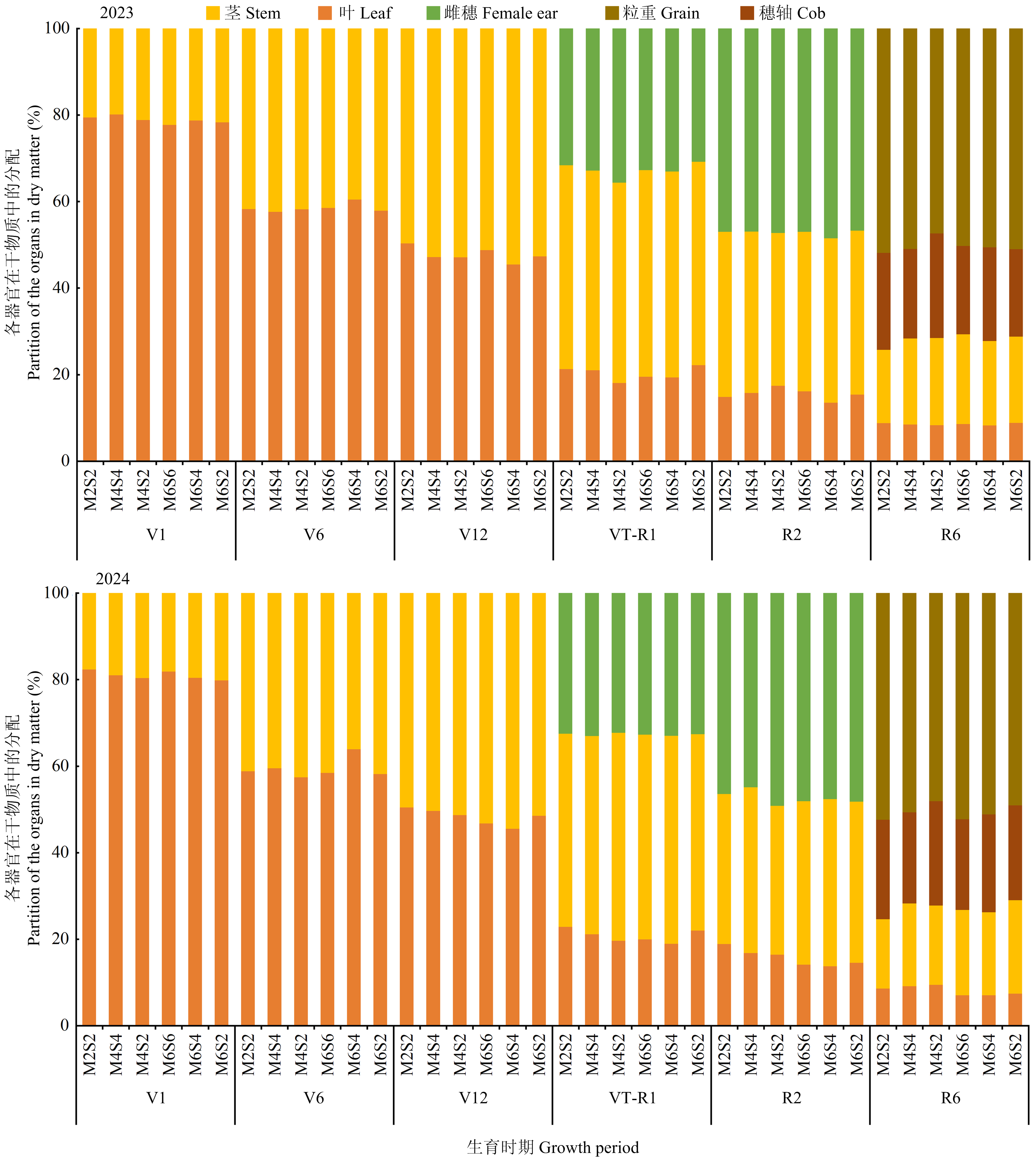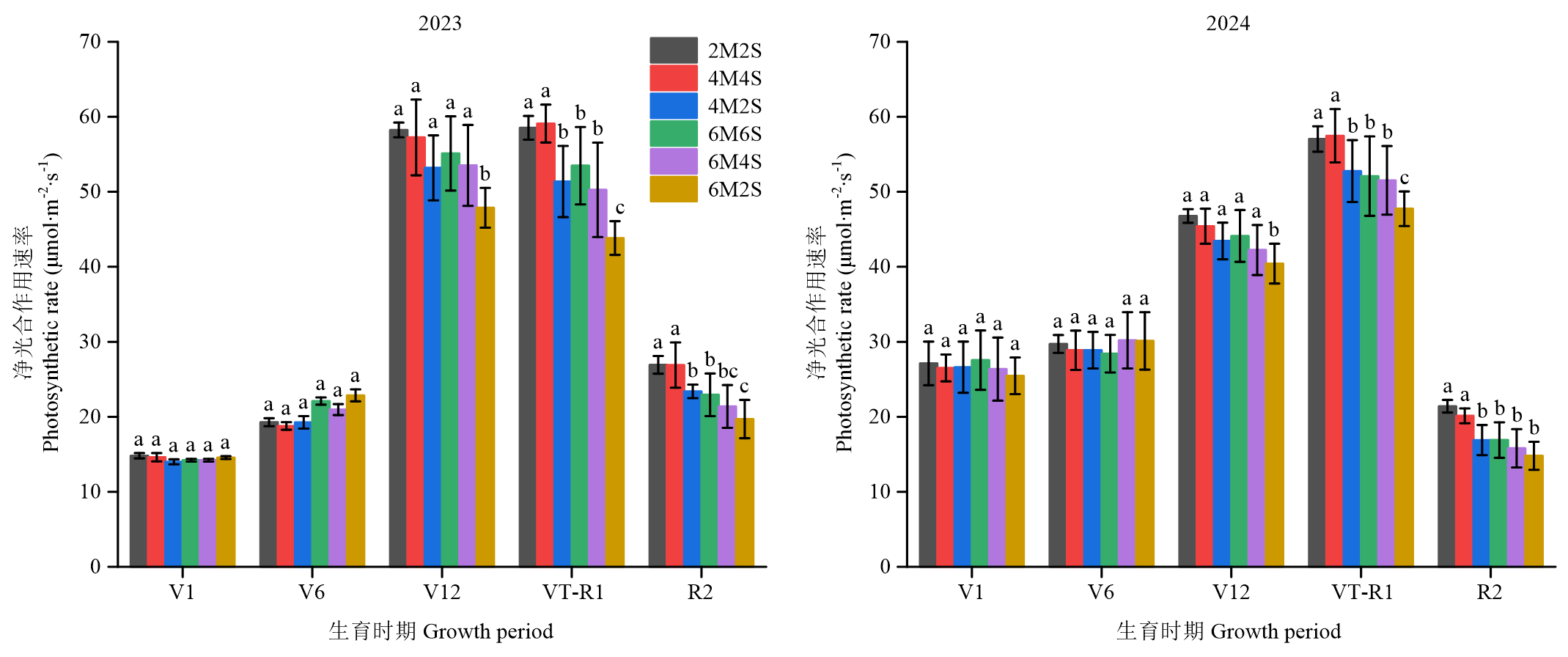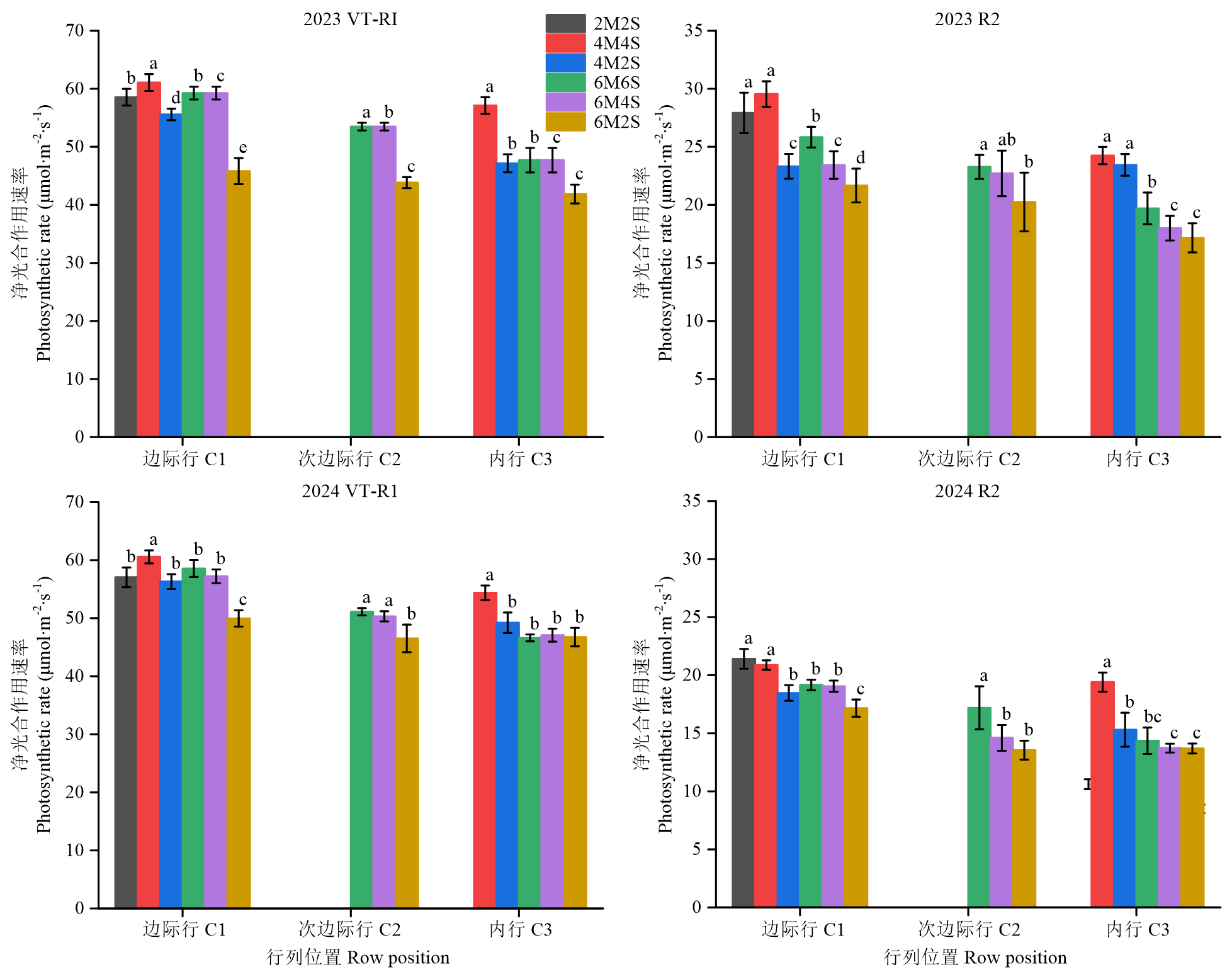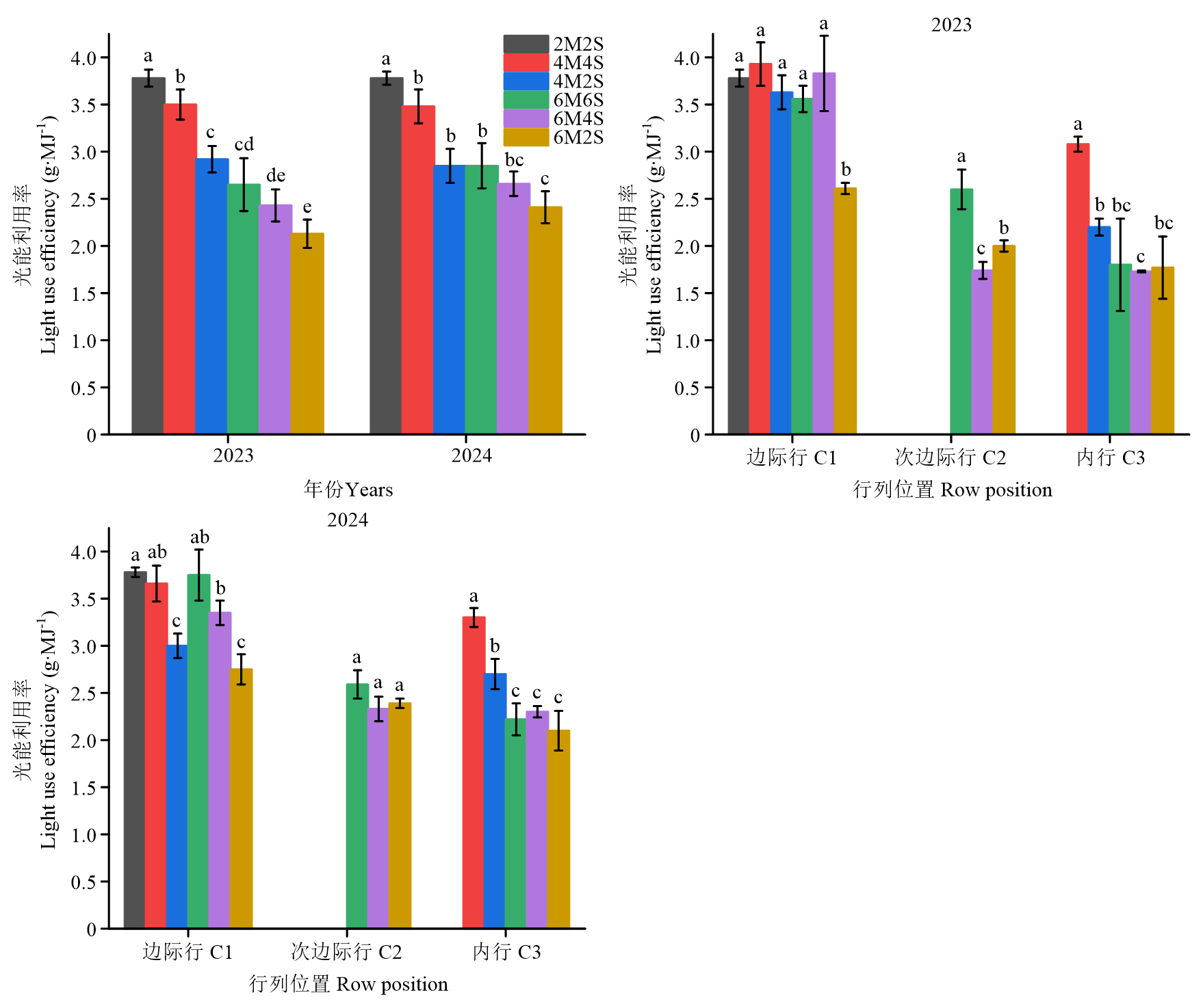 【目的】阐明玉米大豆间作模式对玉米带冠层光环境异质性及光能利用效率和产量形成的影响,明确大兴安岭沿麓黑土区适宜机械化作业的玉米大豆间作模式,以促进该地区农业生产效率提升。【方法】于2023—2024年在内蒙古大兴安岭沿麓黑土区阿荣旗开展田间试验,以玉米‘益农玉12’和大豆‘东生19’为供试材料,对玉米冠层光环境进行可视化,分析2行玉米-2行大豆(2M2S)、4行玉米-4行大豆(4M4S)、4行玉米-2行大豆(4M2S)、6行玉米-6行大豆(6M6S)、6行玉米-4行大豆(6M4S)、6行玉米-2行大豆(6M2S)6个间作处理的冠层结构、光能利用和产量形成的差异性。【结果】(1)4M4S因增加了边际行进光量且内行光环境得到改善,整体冠层结构指标较好,2M2S次之;4M4S和2M2S在抽雄-吐丝期和灌浆期光能利用效率及光合速率显著高于其余处理。(2)4M4S玉米产量差异与2M2S不显著,大豆产量显著高于2M2S,4M4S土地当量比最高,两年分别为1.61和1.60,其余处理分别在1.31—1.56和1.28—1.53;且4M4S机具适配性更好,结合作业成本,产投比最高,达6.61,分别比其他处理提高7.39%—32.28%。【结论】冠层上层(L160、L200)是间作玉米光环境调控和光合作用发挥作用的关键层位,不同空间行位间,冠层结构、光合特性与产量形成的关联程度存在明显差异,且以边行玉米最为显著。Mantel检验表明,光环境结构与光合效率之间存在较强耦合关系,冠层受光条件的改善能够通过增强光合作用促进产量形成。4M4S受边际效应增强和内行光分布改善,玉米产量与传统2M2S模式差异不显著,但大豆产量显著提高(P<0.05),土地当量比最高、复合产投比更高。在大兴安岭沿麓黑土区,4M4S间作模式能够在增产增效的同时,实现全程机械化作业水平的提升和促进生态农业可持续发展。