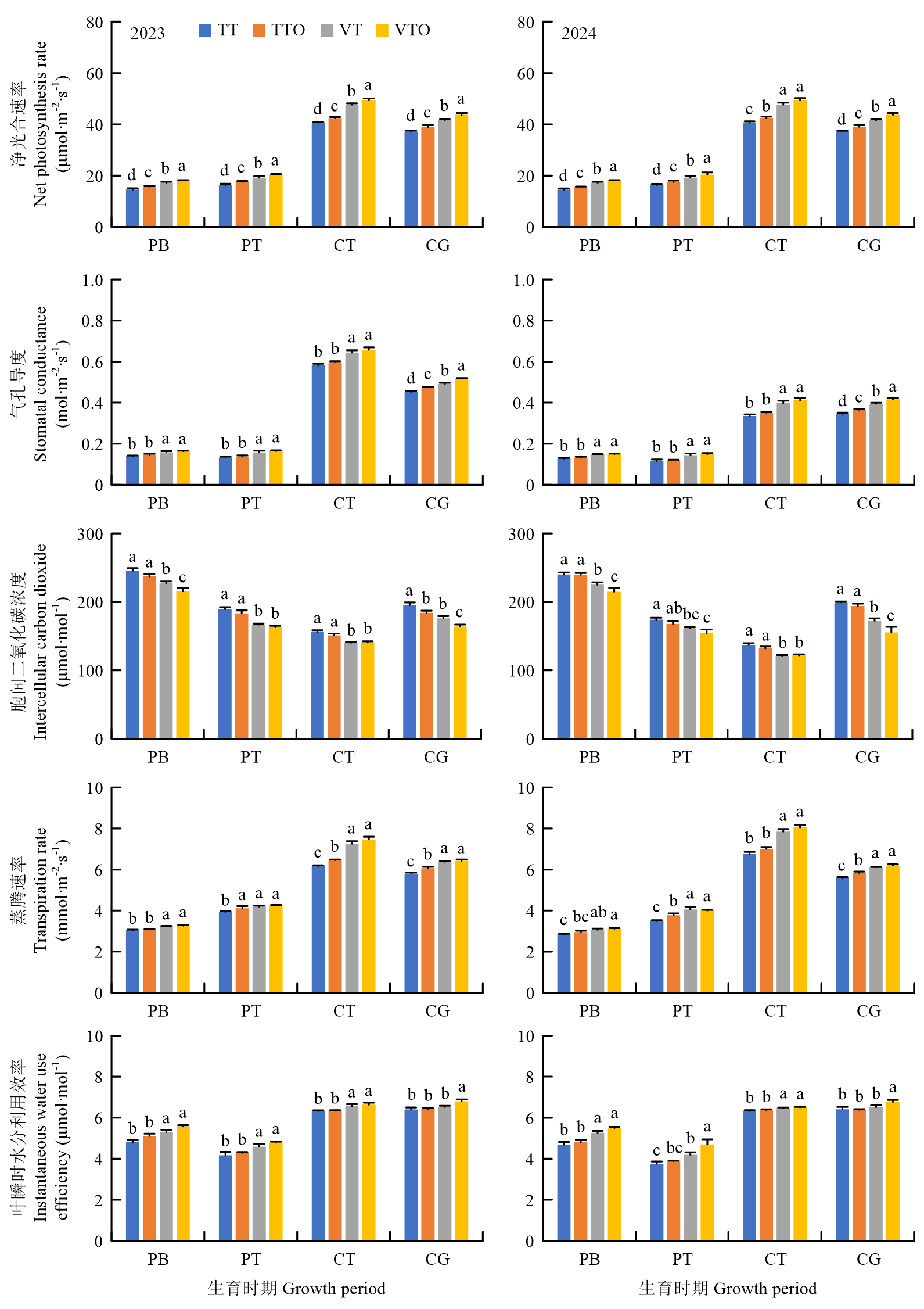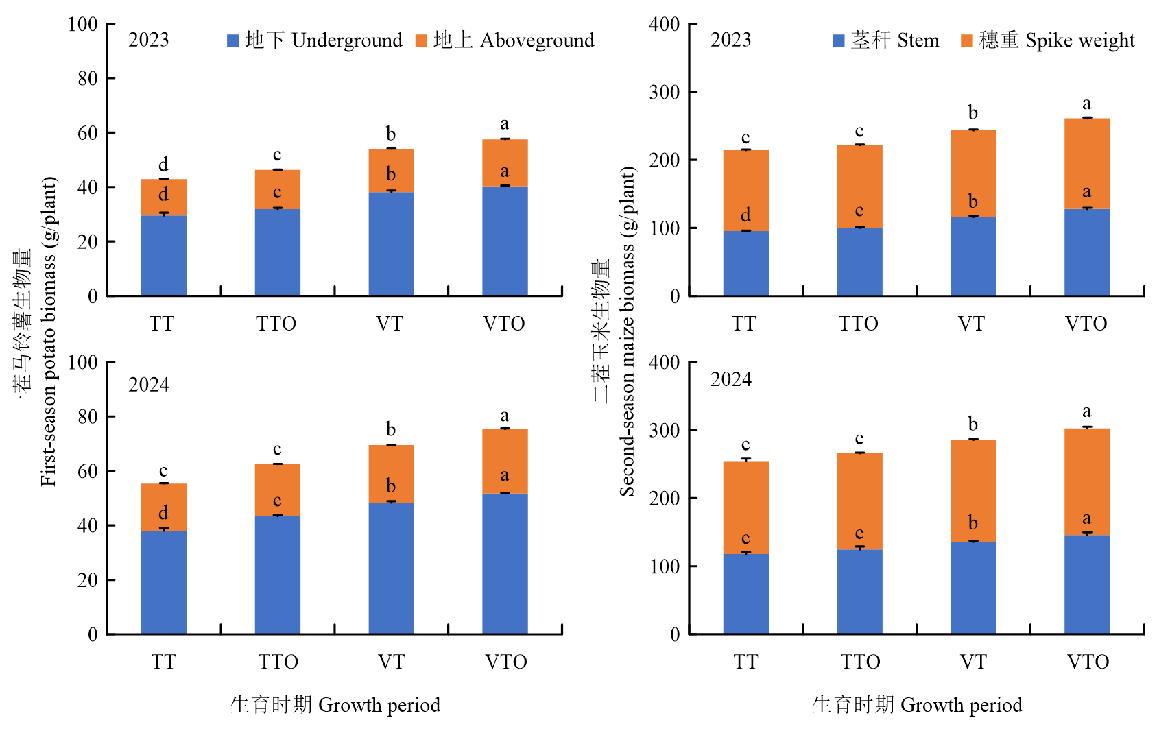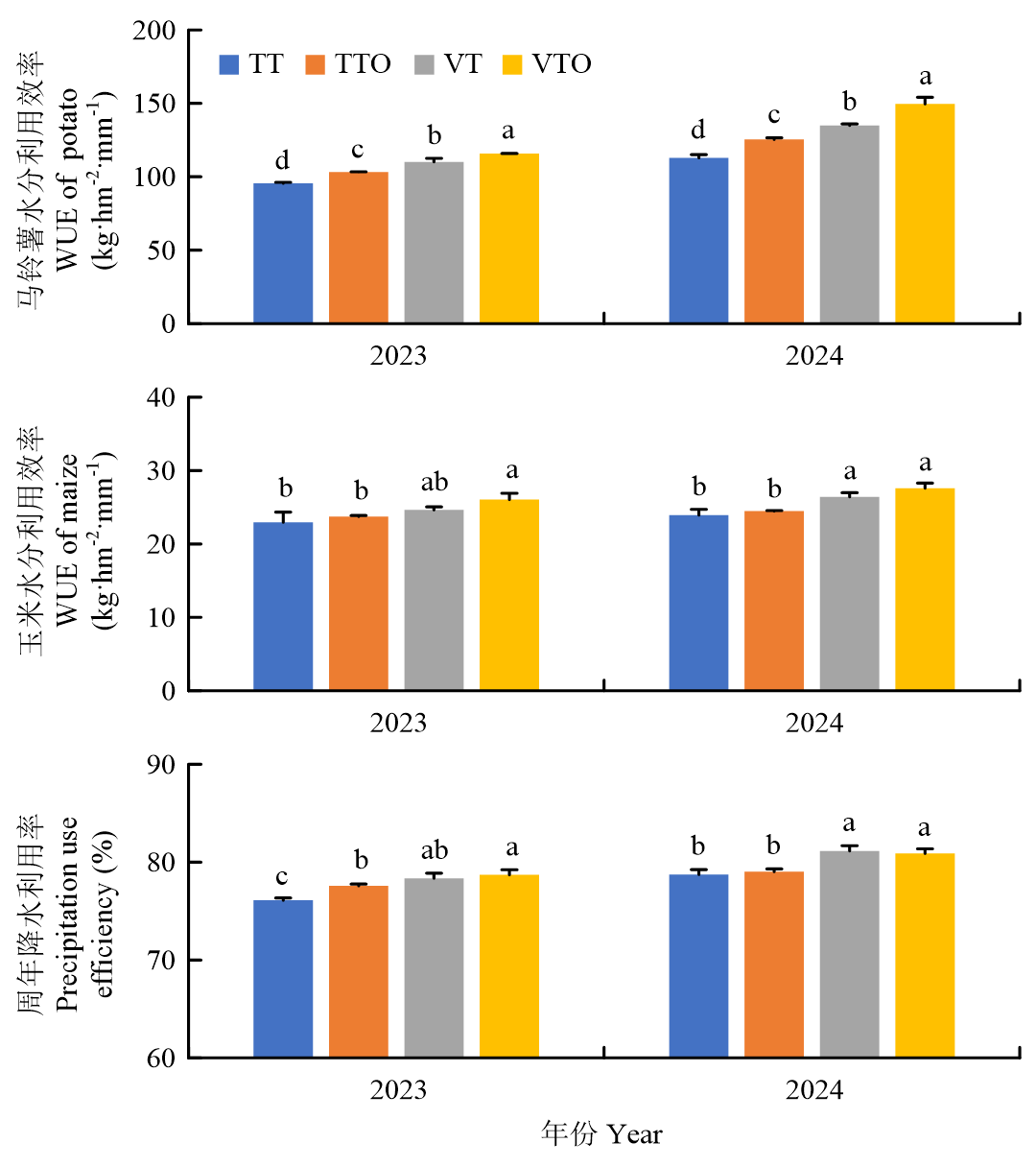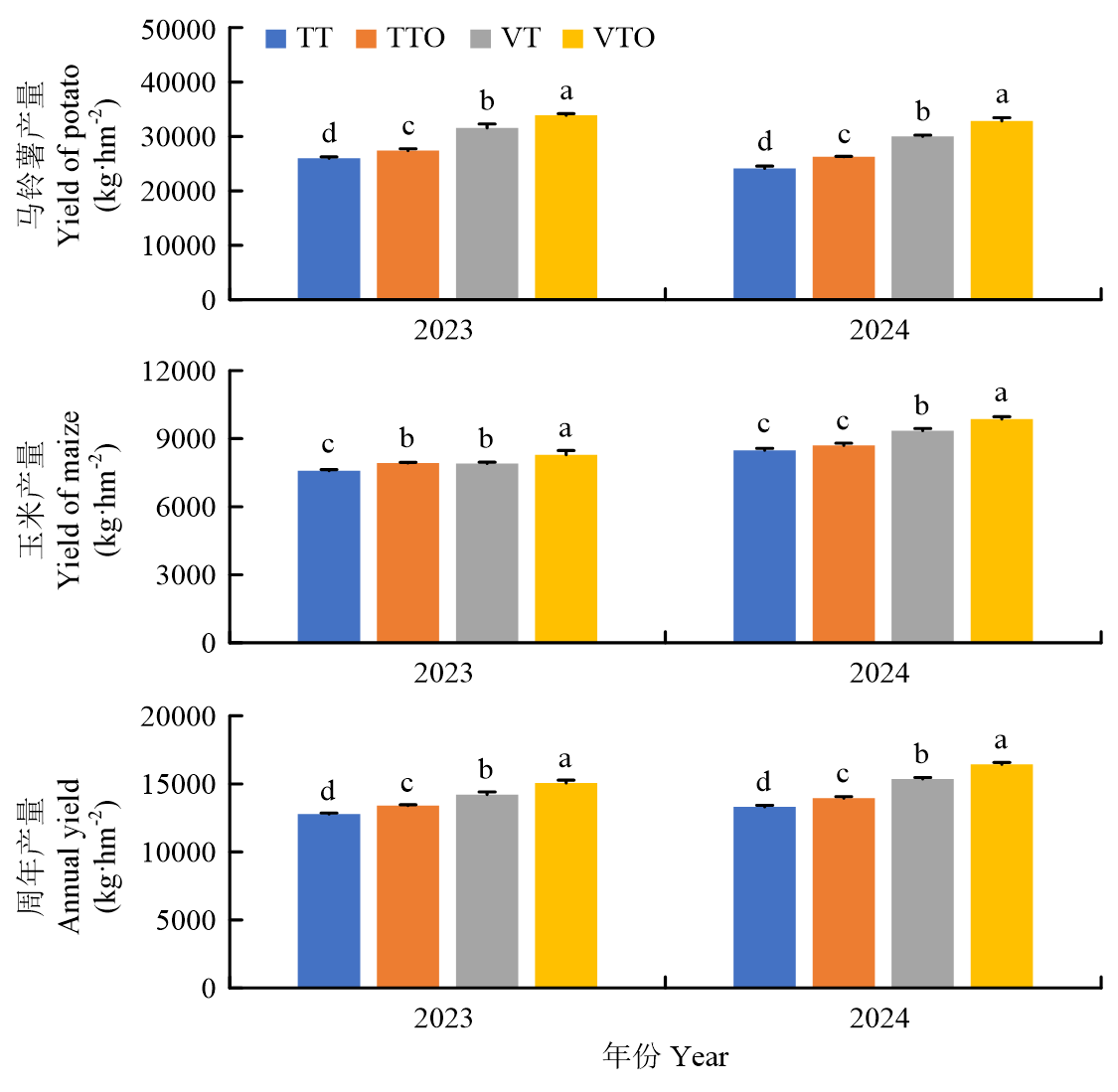 【目的】针对陇东黄土丘陵区传统一年一熟制生产效率低、水热资源利用率不充分的问题,通过引入早熟马铃薯-玉米轮作模式,旨在突破原有种植制度限制,充分挖掘区域水热资源潜力。为进一步优化该新模式的生产效益与可持续性,本研究重点探究不同耕作与施肥措施对马铃薯-玉米一年两熟轮作系统光合特性、水分利用及产量和效益的影响,以期为提升农田周年生产力提供关键技术依据。【方法】于2023—2024年以早熟马铃薯(荷兰15号)和早熟玉米(科沃028)为材料,设置传统旋耕(TT)、传统旋耕+有机肥(TTO)、立式深旋(VT)和立式深旋+有机肥(VTO)4个处理,测定作物地上地下生物量、光合特性、产量及产量构成,计算水分利用效率和经济效益。【结果】与TT相比,VT和VTO处理显著提升了马铃薯成熟期的地上生物量和块茎产量,以及玉米成熟期的茎秆重和穗重。VT和VTO处理分别增加了马铃薯的单穴薯数、单穴薯重和商品薯率,同时提升了玉米的行粒数和百粒重。VTO处理下马铃薯和玉米产量分别达到32 853—33 879和8 289—9 860 kg·hm-2,周年总产量达到15 065—16 431 kg·hm-2(折粮)。相较于TT,VT和VTO处理下马铃薯产量提高21.5%—24.5%和30.4%—36.2%,玉米产量提高4.2%—10.3%和9.3%—16.2%,周年总产量增幅达11.2%—15.4%和17.8%—23.5%。VT和VTO处理还协同增强了作物光合能力,在马铃薯和玉米的关键生育时期,显著提高了叶片相对叶绿素含量(SPAD)值、净光合速率、气孔导度和蒸腾速率,同时降低了胞间CO2浓度,改善了叶片瞬时水分利用效率。VT和VTO处理使马铃薯水分利用效率提升15.4%—19.6%和21.3%—32.5%、玉米水分利用效率提升7.3%—10.4%和13.4%—15.3%,周年降水利用率提高3.0%—3.1%和2.7%—3.4%;VTO和VT周年纯收入较TT处理分别增加19.9%—31.8%和32.7%—40.5%,VTO较VT处理减少6.3%—9.6%。以上指标除经济效益外,VTO处理在其余各项指标上的表现均优于VT,且有更好的土壤改良潜力,可实现农业可持续性。【结论】在陇东黄土丘陵区推广早熟马铃薯-玉米一年两熟制时,立式深旋结合有机肥(VTO)是实现作物产能和生态效益协同优化的最有效途径。该措施不仅为马铃薯-玉米双季栽培制度的稳定实施提供了有力保障,还有助于达成周年“吨粮田”的高产目标。尽管短期内VTO处理的经济效益略低于VT处理,但其在推动区域旱作农业资源高效与可持续利用方面显示出重要的技术支撑价值和长远潜力。