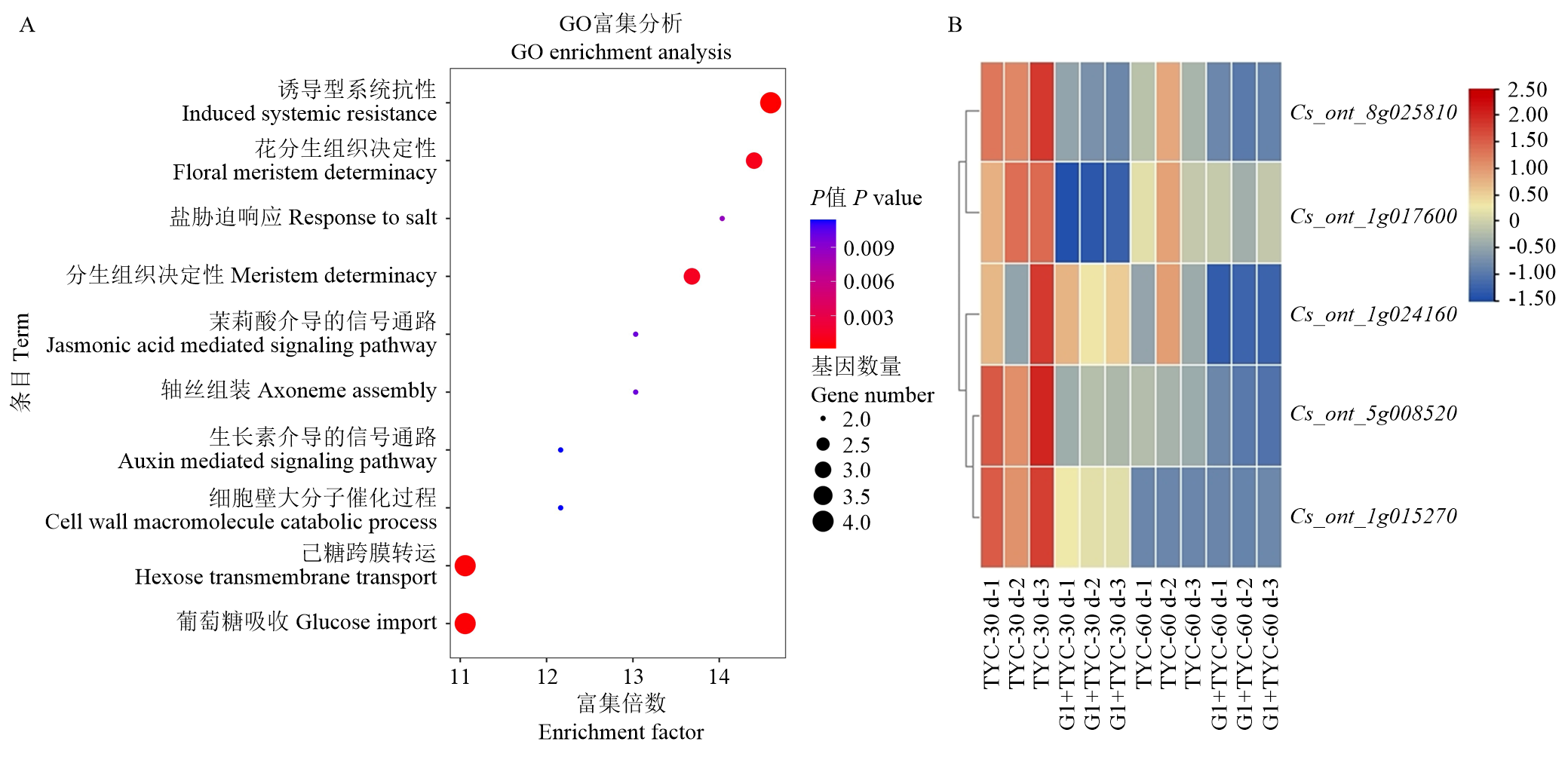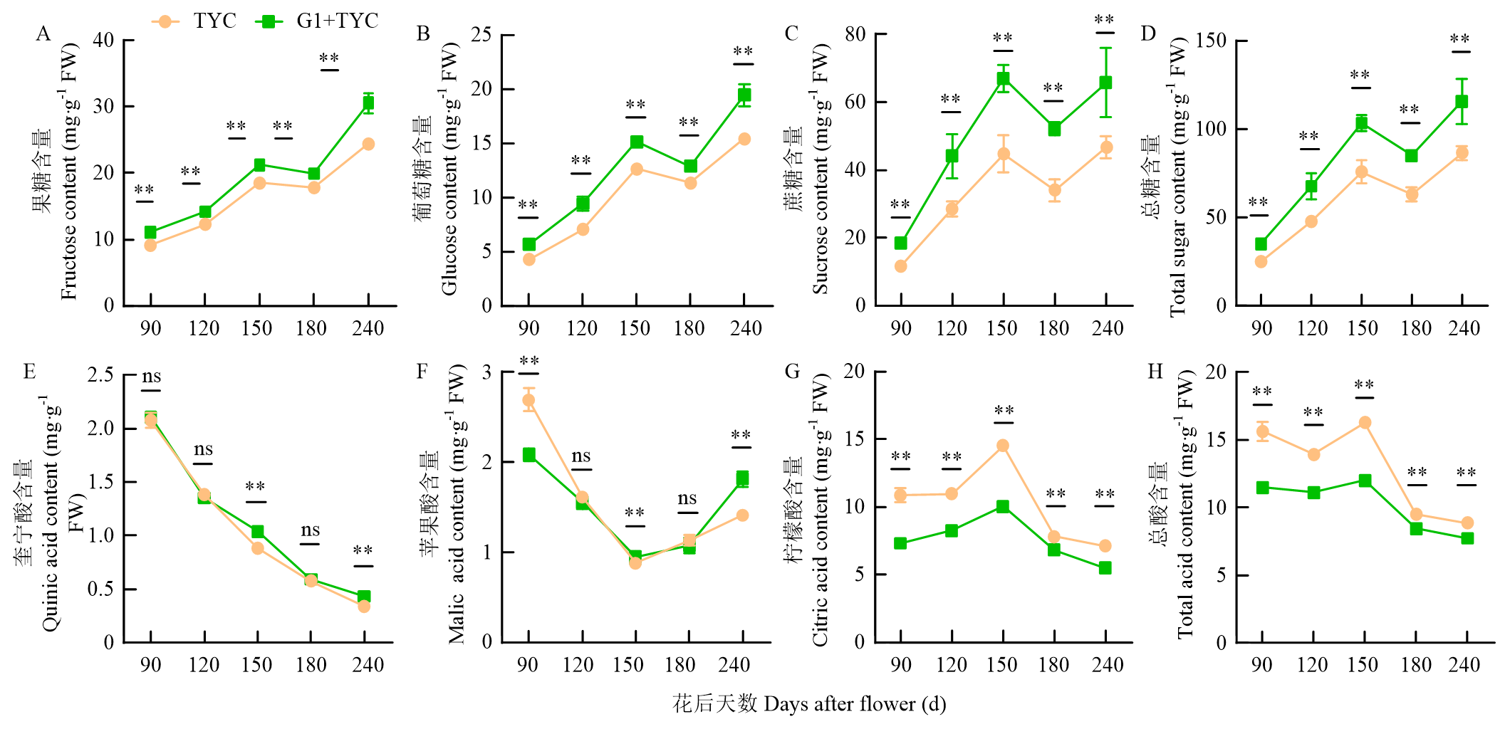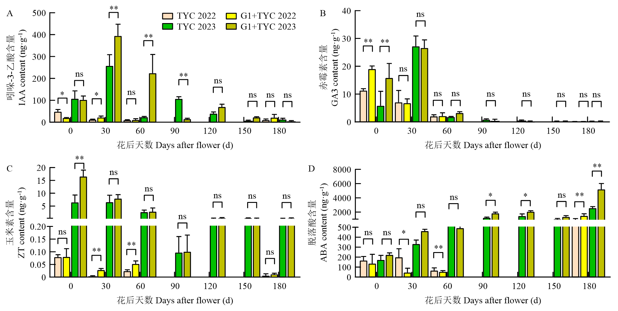 【目的】以原生质体融合技术创制的‘温州蜜柑+桃叶橙’胞质杂种(G1+TYC)及其叶肉亲本桃叶橙(TYC)为材料,探究G1+TYC果实增大的生理原因并鉴定关键基因,为柑橘果实大小的分子机理研究提供理论依据。【方法】以G1+TYC和TYC不同发育时期的子房或果肉为材料,通过对不同发育时期(包括成熟期)果实大小、果实糖酸与内源激素含量测定,以及转录组分析,明确G1+TYC果实增大的生理原因,并挖掘控制果实大小的关键基因。【结果】果实大小动态监测结果显示,G1+TYC果实横径和纵径分别于花后75和105 d时显著大于TYC,差异持续至果实成熟(花后240 d)。以2022年数据为例,花后240 d时,G1+TYC的果实横径、纵径分别为79.14和66.75 mm,而同期TYC的果实横径、纵径仅为56.02和53.20 mm,直观反映G1+TYC果实相较于TYC显著增大。G1+TYC成熟果实单果质量、囊瓣宽度、单汁胞重量和面积显著大于TYC,表明汁胞体积增大引起囊瓣宽度增加,是导致G1+TYC体积增大的原因。糖酸含量测定表明,花后90—240 d,G1+TYC果肉中果糖、葡萄糖、蔗糖含量均显著高于TYC,而柠檬酸和总酸含量则显著低于TYC,奎宁酸和苹果酸含量差异无明显规律。内源激素含量测定表明,花后30—60 d,G1+TYC果肉中吲哚-3-乙酸(IAA)含量显著高于TYC,赤霉酸(GA3)含量仅在花后0 d显著高于桃叶橙,玉米素(ZT)含量两年间重复性差,脱落酸(ABA)含量在花后90 d迅速增加,且G1+TYC果肉ABA含量在花后180 d显著高于TYC。结合转录组数据和GO功能富集分析,筛选出5个与IAA代谢相关的基因,在G1+TYC和TYC花后30—60 d果肉中差异表达,可能是决定G1+TYC果实增大的关键候选基因。【结论】明确了汁胞体积增大和果实发育早期果肉中IAA含量升高与G1+TYC果实增大密切相关,基于转录组分析发掘了G1+TYC果实增大相关候选基因。
