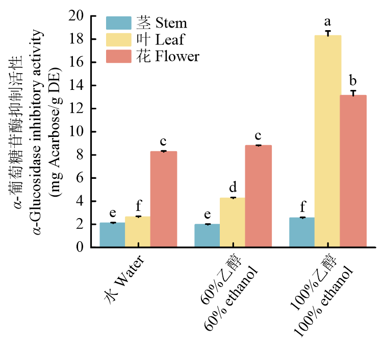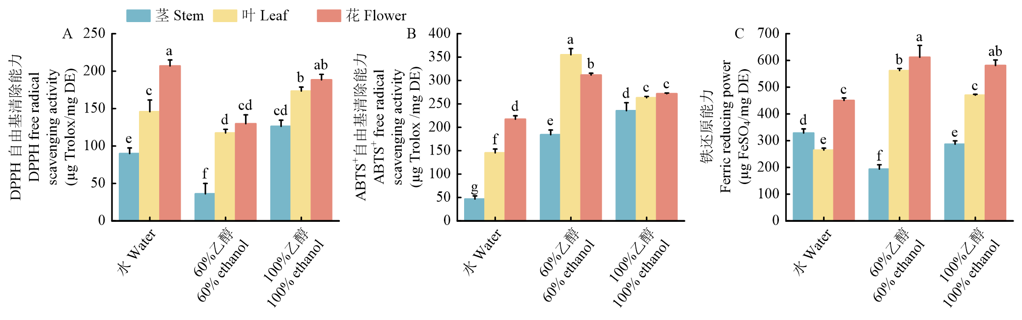 【目的】评价紫皮石斛茎、叶、花提取物的化学成分、体外抗氧化及降血糖活性,并基于代谢组学揭示其活性差异的物质基础,为紫皮石斛资源的高值化开发和功能食品制备提供理论依据。【方法】以紫皮石斛的茎、叶和花为材料,采用不同浓度乙醇(0、60%、100%)进行提取,测定其总糖、总酚、总黄酮含量,并评估DPPH、ABTS+清除能力、铁还原能力(FRAP)及α-葡萄糖苷酶抑制活性。利用高效液相色谱(HPLC)定量分析酚类成分,结合非靶向代谢组学技术比较不同部位代谢物组成,通过偏最小二乘判别分析(PLS-DA)和KEGG通路富集分析筛选关键差异代谢物及代谢通路。【结果】紫皮石斛茎提取物中总糖含量最高,而花提取物总酚、总黄酮含量及抗氧化活性均显著高于茎和叶。60%乙醇提取物的总黄酮含量和ABTS+清除能力、FRAP值最强,100%乙醇提取物的总酚含量和DPPH清除能力最高。花和叶的α-葡萄糖苷酶抑制能力优于茎。HPLC分析共鉴定出11种酚类化合物,其中60%乙醇提取物中种类最多、含量最高。代谢组学共鉴定出1 859种代谢物,其中1 051种为差异代谢物,脂质、有机酸及其衍生物等类别的代谢物与抗氧化和降血糖活性显著相关。【结论】紫皮石斛茎、叶、花均具有显著的抗氧化和降血糖活性,其活性差异与提取溶剂及部位密切相关。花表现出最优的综合生物活性。