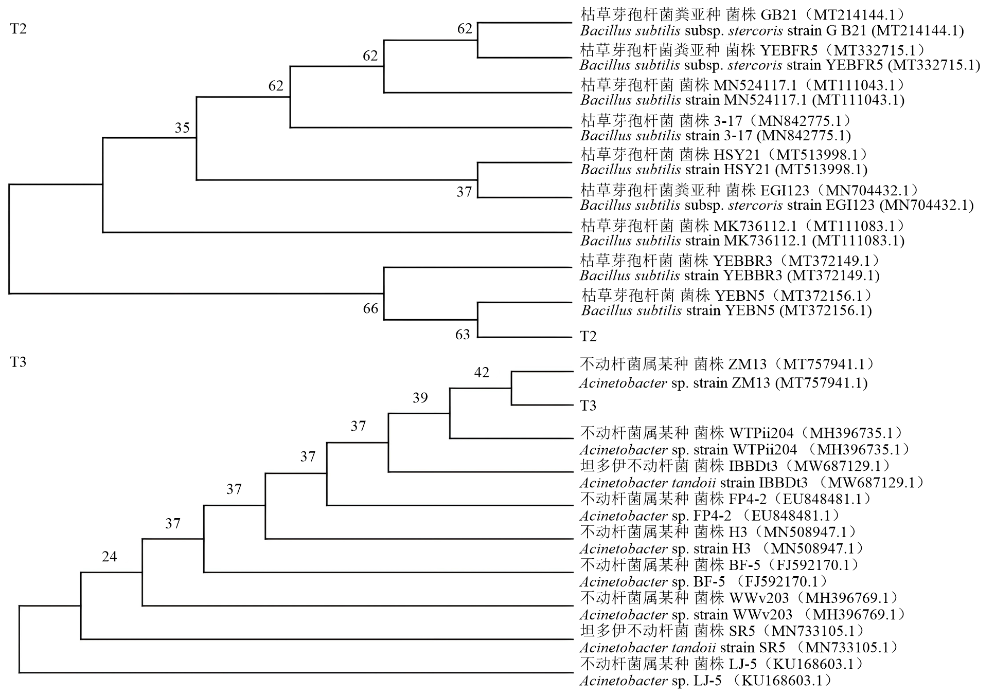【Background】Trimethylamine (TMA) is a typical nitrogen-containing amine organic pollutant, and one of the main malodorous gases causing odor pollution in animal husbandry. This gas is a harmful gas with a strong fishy odor. It not only causes point-source pollution in farming areas, but also its long-term exposure poses potential health risks to humans, attracting people's attention in recent years. 【Objective】This study aimed to screen high-efficiency TMA-removing strains with strong degradation ability by collecting large amounts of animal manure, for providing excellent strains for the prevention and control of TMA pollution in livestock farming. 【Method】In this study, efficient TMA-removing strains were screened from the manures of pigs and cows by the methods of enrichment culture, isolation, purification, and deodorization ability measurement. Then the strains were identified using morphological observation and 16S rRNA gene analysis to determine their taxonomic characteristics. On this basis, the effects of different pH values (5.0, 6.0, 7.0, 8.0, and 9.0), carbon sources (glucose, sucrose, fructose, maltose, and xylose), salinities (0, 0.5%, 1.0%, 1.5%, and 2.0%), and inoculum concentrations (1%, 5%, 10%, 15%, and 20%) on bacterial biomass were further investigated to define the optimal growth conditions for the strains. Moreover, the actual deodorization effect of the efficient strains was verified by investigating the release concentration and removal rate of TMA during the initial stage of feces fermentation. 【Result】(1) A total of 10 TMA-removing strains, named T1 to T10, were isolated from livestock manure, among which strain T2 (Bacillus subtilis) and strain T3 (Acinetobacter sp.) exhibited the highest removal abilities of TMA. The TMA-removing rates after 48 h of incubation reached 26.91% for T2 and 29.59% for T3, which were higher than those of the other eight strains (P < 0.05). (2) Different pH values, carbon sources, salinities, and inoculum concentrations exerted varying effects on the growth of strains T2 and T3. Optimal growth conditions for T2 were as follows: pH=6.0, glucose as carbon source, 0.5% NaCl, and inoculum concentration of 1%; for T3, pH=8.0, sucrose as carbon source, 0.5% NaCl, and inoculum concentration of 1%. Under these optimal conditions above, the strains exhibited the fastest growth rate and achieved the maximum biomass. (3) The verification test of deodorization effect showed that when the feces were supplemented with T2 or T3, the average release amounts of TMA were lower than those in the control group (P < 0.01), and the highest removal rates reached 42.65% for T1 and 39.63% for T2.【Conclusion】Bacillus subtilis (T2) and Acinetobacter sp. (T3) isolated in this study had a high-efficiency ability to remove TMA, and would possess potential utilization value in the field of livestock manure treatment and control of pollution in animal husbandry.