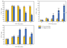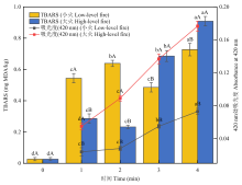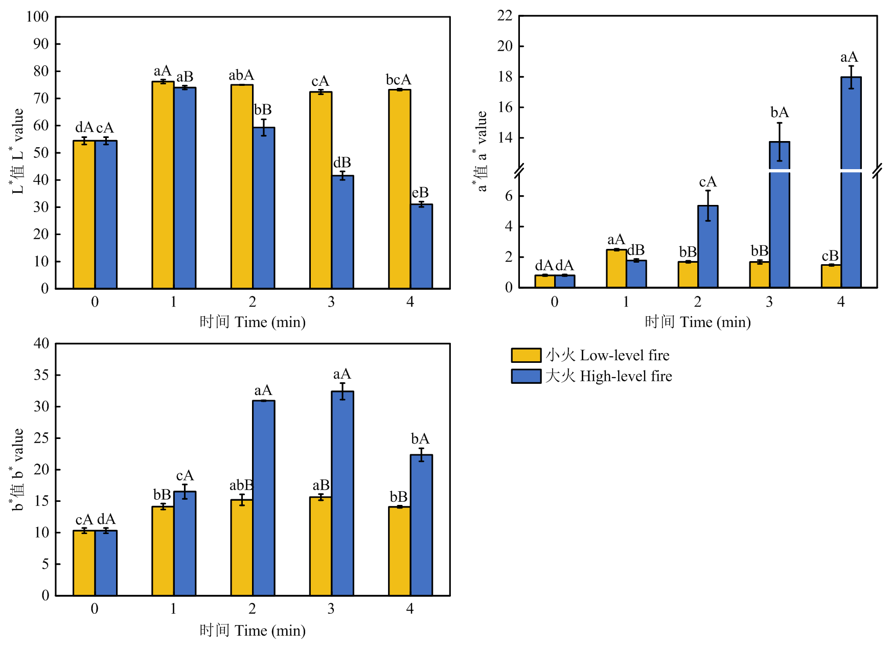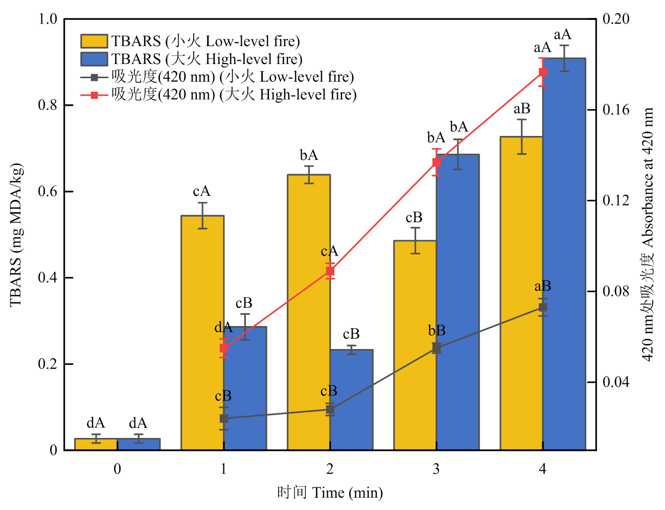 Changes in TBARS values and A420 values of meat slices during stir-frying mediated by different cooking “Huohou” Different lowercase letters indicate that the indicators of the same “Huohou” at different time are significantly different (P<0.05), different uppercase letters indicate that the indicators of different “Huohou” at the same time are significantly different (P<0.05). The same as below"