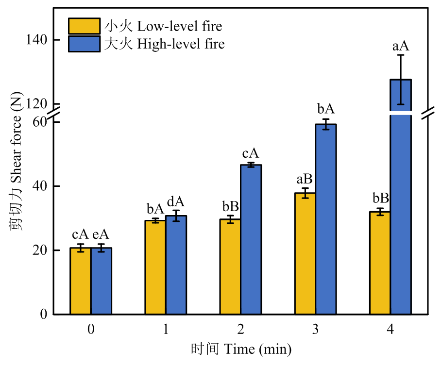 Changes in shear force values of pork slices stir-fried at different cooking “Huohou” for different times"