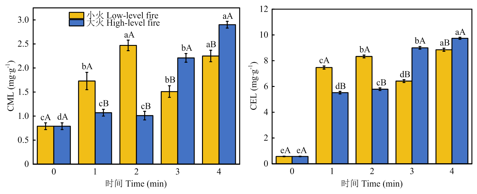 Changes in CML and CEL contents of pork slices stir-fried at different cooking “Huohou” for different times"