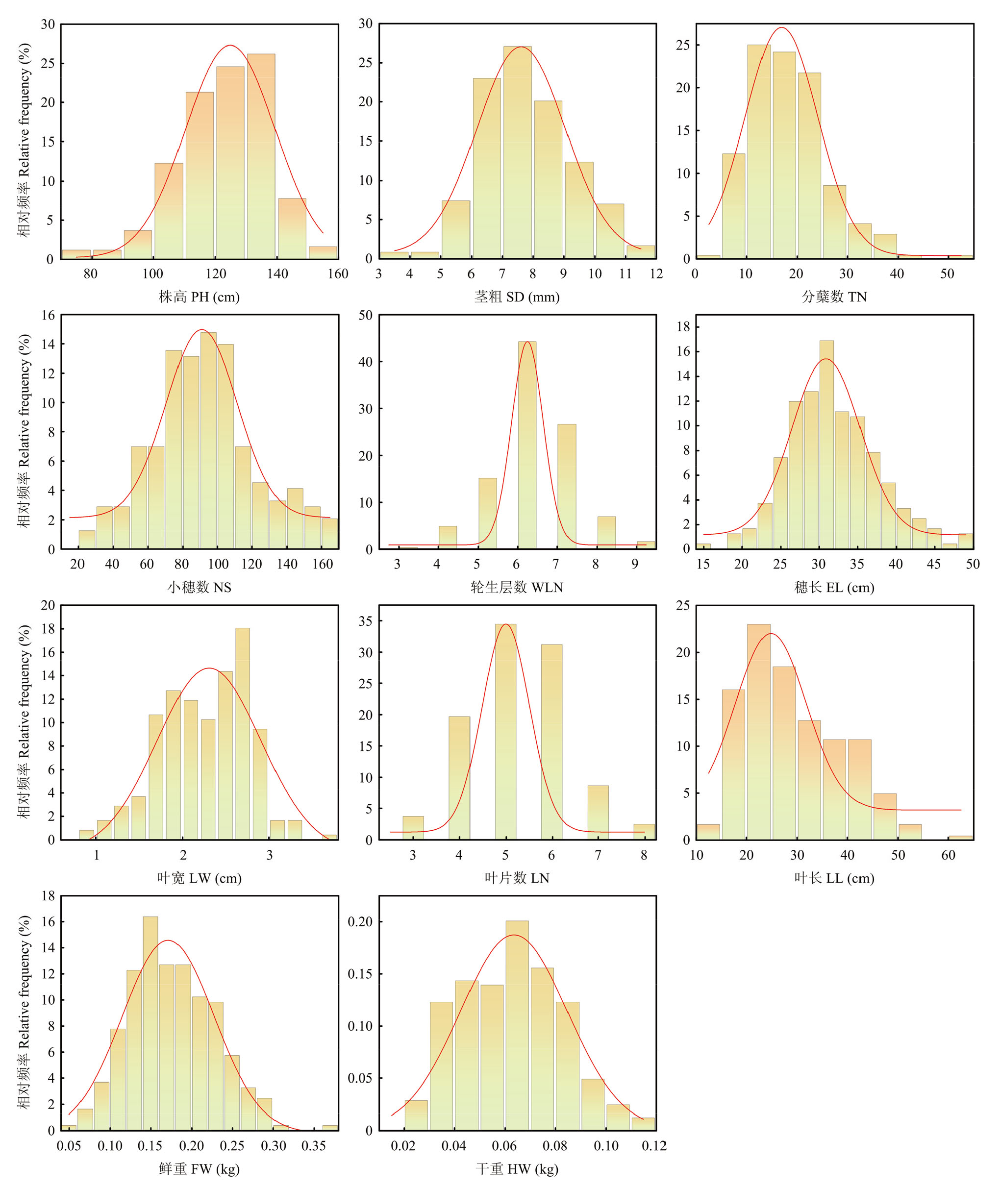Frequency distribution of quantitative traits in 244 forage oat germplasm resources PH: Plant height; SD: Stem diameter; TN: Tiller number; LN: Leaf number; LL: Leaf length; LW: Leaf width; EL: Ear length; WLN: Whorled layers number; NS: Number of spikelets; FW: Fresh weight; HW: Hay weight. The same as below"