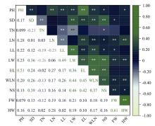 Correlation analysis plot for 11 quantitative traits * and ** means significant (P<0.05) and highly significant (P<0.01) correlations between traits, respectively"