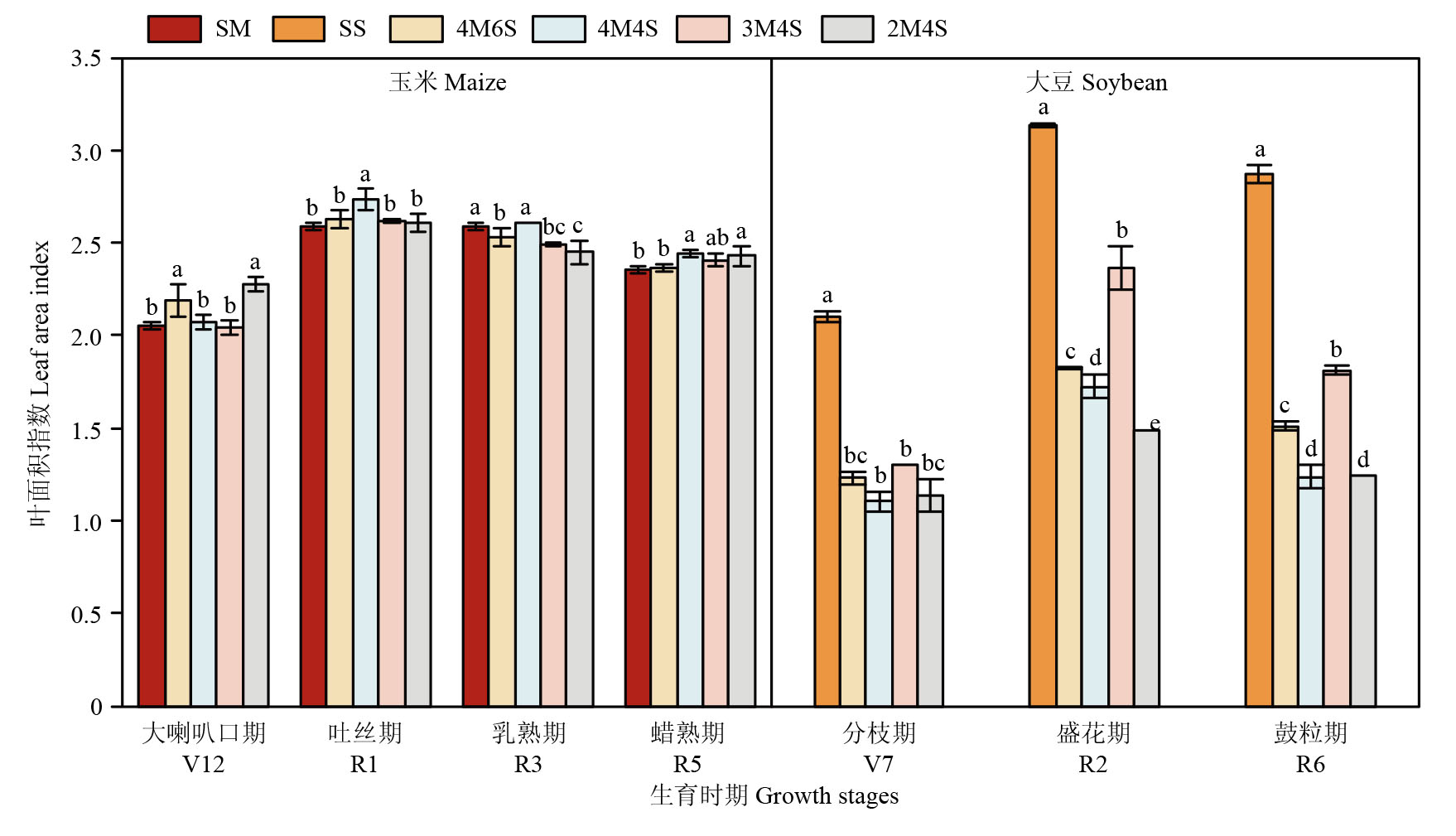 Key words: maize-soybean intercropping, leaf area index, canopy light distribution, photosynthetic performance, yield