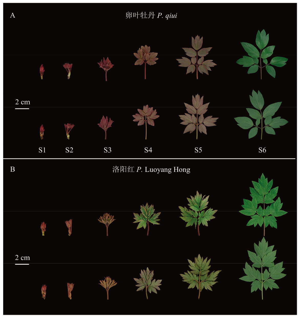 Leaf phenotypes at different developmental stages in P. qiui and P. Luoyang Hong A: Leaf phenotypes of P. qiui at different developmental stages; B: Leaf phenotypes of P. Luoyang Hong at different developmental stages"
