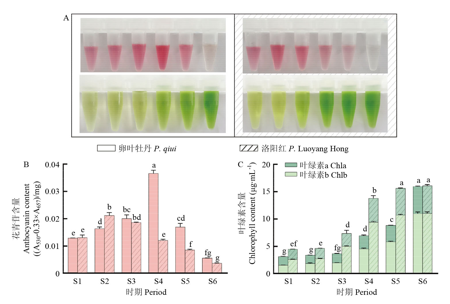 Pigment contents of leaves at different developmental stages of P. qiui and P. Luoyang Hong A: Anthocyanin extracts and chlorophyll extracts; B: Anthocyanin content in leaves; C: Chlorophyll content in leaves. Different lowercase letters indicate significant differences at P<0.05 level. The same as below"