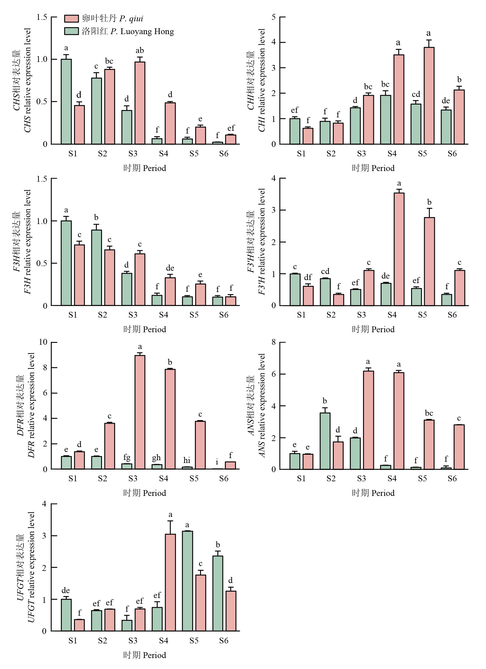Expression analysis of genes related to anthocyanin synthesis at different developmental stages of P. qiui and P. Luoyang Hong"