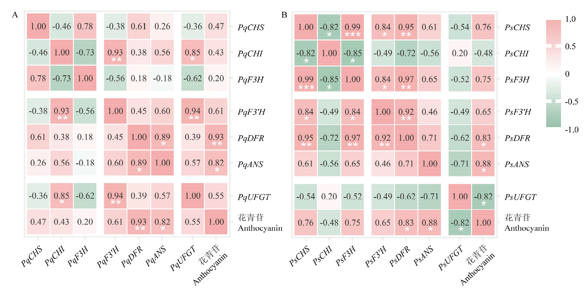 Correlation analysis between anthocyanin content and structural gene expression in the leaves of P. qiui and P. Luoyang Hong"
