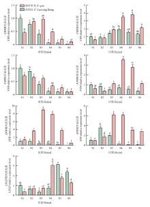 【Objective】 Tree peony, renowned for its ornamental flowers, also serves as a spring foliage plant due to the striking purple-red coloration of its young leaves. Elucidating the physiological mechanisms and key genes underlying red color leaf traits provides a theoretical basis for breeding ornamental foliage cultivars. 【Method】 Leaf samples were collected at six developmental stages from Paeonia qiui and P. Luoyang Hong. Leaf color parameters were measured using a colorimeter. Anthocyanin and chlorophyll contents were quantified through enzymatic methods. The composition of anthocyanins was analyzed by high performance liquid chromatography (HPLC). Furthermore, quantitative real-time PCR (qPCR) was utilized to examine the expression levels of structural genes involved in anthocyanin biosynthesis. 【Result】 Phenotypic observations and colorimetric analyses revealed that P. qiui exhibits a higher redness and a prolonged red-leaf period that persists until flowering. Conversely, P. Luoyang Hong displays red coloration in its young leaves during the early stages, but this red hue rapidly transitions to green following leaf expansion. HPLC analysis revealed that both tree peonies had peonidin-3,5-diglucoside (Pn3G5G) as the main anthocyanin component in leaves. The total anthocyanin content in P. qiui was significantly higher than that in P. Luoyang Hong, with the most pronounced difference observed during the S4 stage. qPCR results showed that the expression levels of CHS, DFR, and ANS in P. qiui were consistent with the trend in anthocyanin content. Correlation analysis further revealed a highly significant positive correlation between DFR expression levels and anthocyanin content, as well as a significant positive correlation for ANS. These findings underscore the critical role of DFR and ANS as key structural genes in anthocyanin biosynthesis. Similarly, in P. Luoyang Hong, the expression levels of CHS, F3H, DFR, and ANS generally aligned with the trends in anthocyanin content. Correlation analysis confirmed that both DFR and ANS expression levels were significantly positively correlated with anthocyanin content. 【Conclusion】 The primary pigment responsible for the red coloration in the leaves of P. qiui and P. Luoyang Hong is peonidin-3,5-diglucoside. DFR and ANS are key structural genes in the anthocyanin biosynthesis pathway of tree peony. Their expression levels are closely associated with anthocyanin accumulation, which in turn influences the formation of red leaf coloration in peonies.